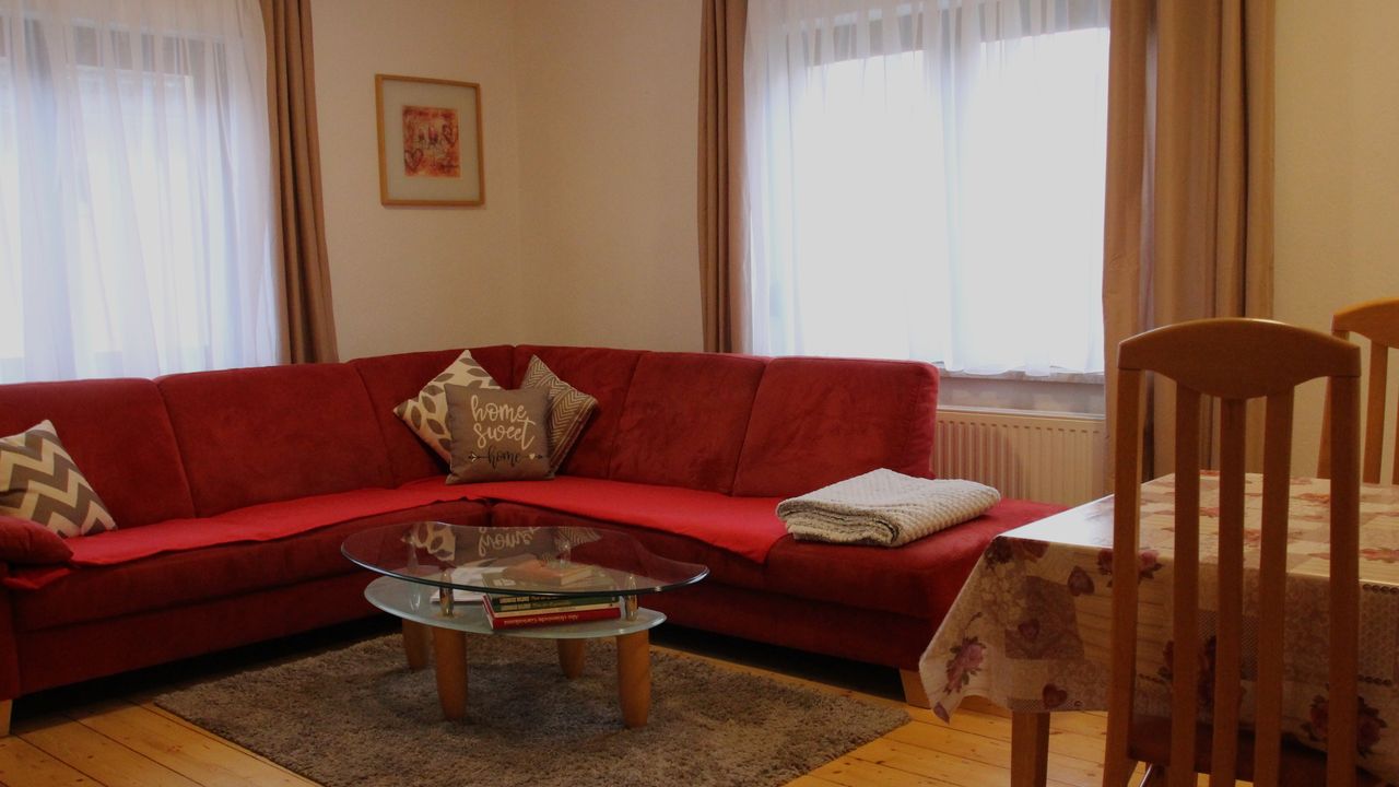 Im Wohnzimmer steht ein großes Ecksofa für geselliges Beisammen sein, ein Fernseher und ein Tisch mit Stühlen. Außerdem gibt es lustige Gesellschaftsspiele im Schrank für Tage, wo das Wetter nicht so schön ist.