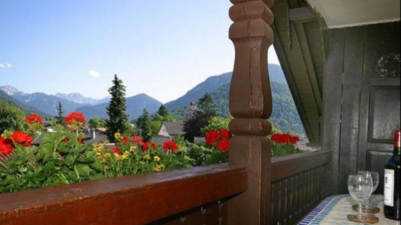 Bayerisch gemütliche 3 Zimmer-Wohnung (70 qm) im 2. Stock mit überdachtem Balkon. Große Wohnküche mit Eckbankgruppe, Kabel-TV, Radio, großer Küchenzeile mit Mikrowelle, Geschirrspüler und Kühl-Gefrierkombination. Wohnzimmer mit Couch und Sesseln sowie Schrankbetten für 2 Personen. Schlafzimmer mit Doppelbett. Kleines Einbettzimmer. Dusche mit Doppelwaschbecken. WC separat. Herrlicher Aussichtsbalkon (möbliert) mit Blick über die Dächer von Mittenwald und die umliegende Gebirgswelt.