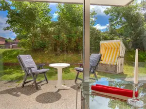 Vom Essplatz erreichen die Terrasse mit Strandkorb und Gartenmöbeln.