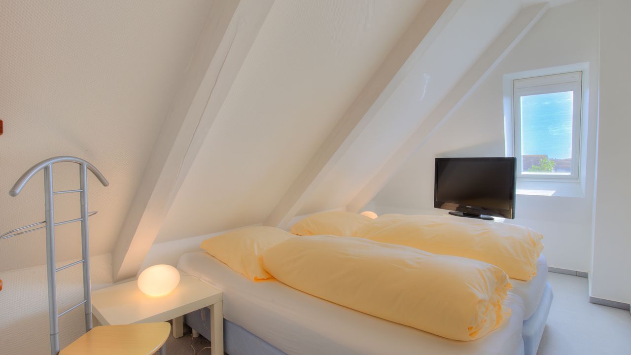 Im gemütlichen Schlafzimmer im Obergeschoss befinden sich ein Boxspringbett sowie ein weiterer Fernseher