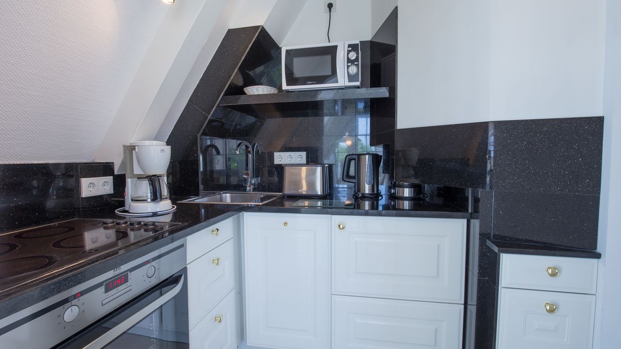 Die schicke Küche mit Backofen und Geschirrspüler ist komplett ausgestattet.