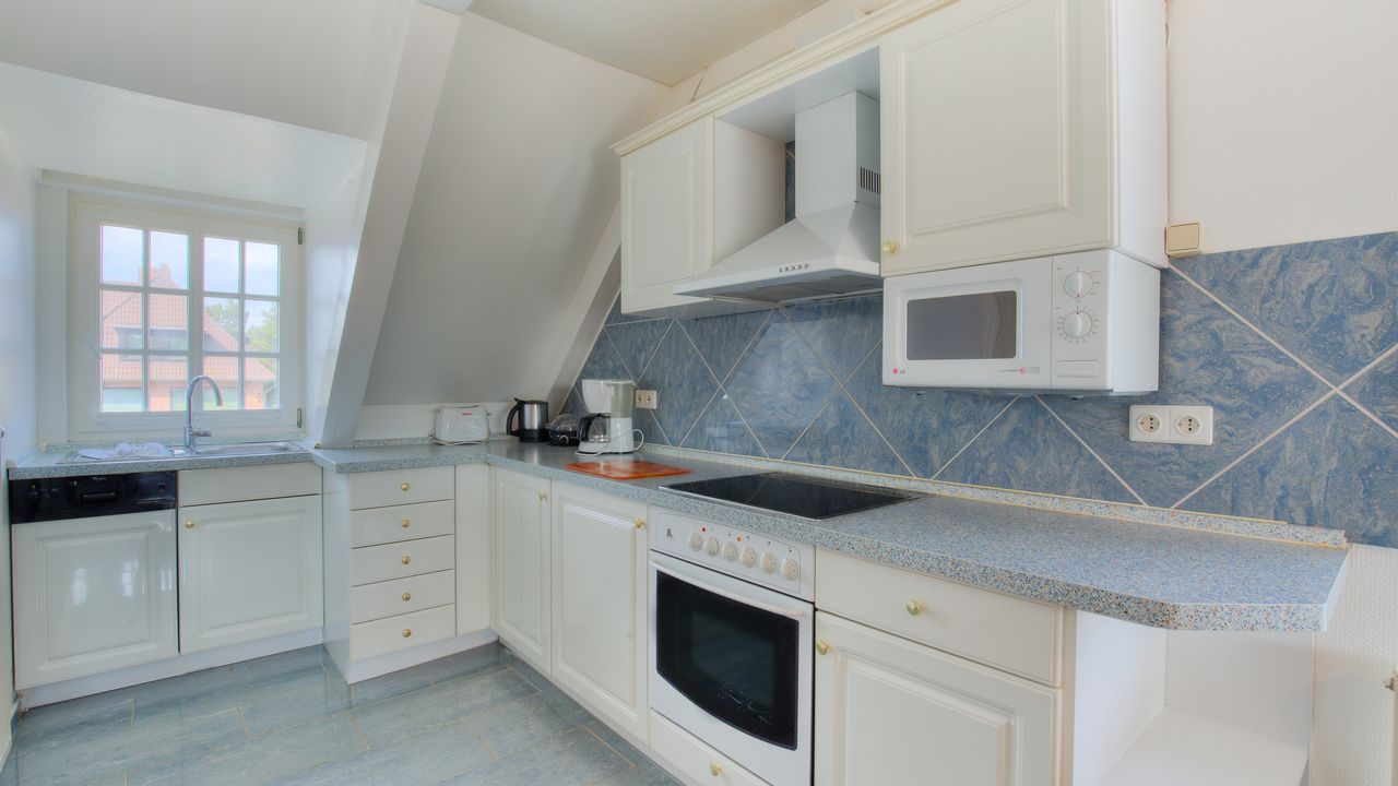Machen Sie entspannt Urlaub auf Sylt in der eleganten 3-Zimmer- Ferienwohnung "Abaco 2N".Über den Vorflur mit Garderobe gelangen Sie in die helle und komplett ausgestattete Wohnküche mit Geschirrspüler, Mikrowelle und Backofen.