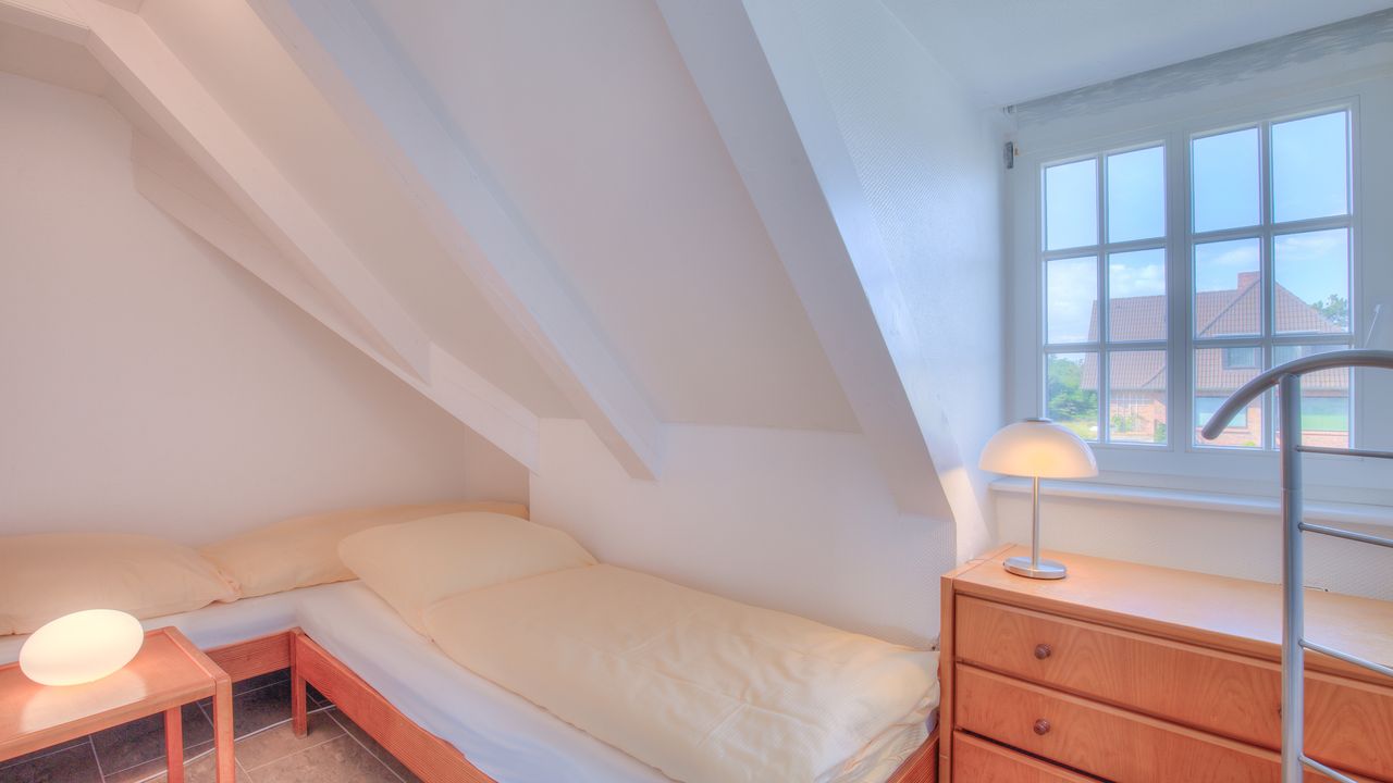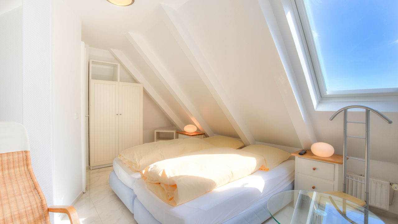 Die Wohnung verfügt im Dachgeschoss über ein gemütliches Schlafzimmer mit Boxspringbett und Fernseher.