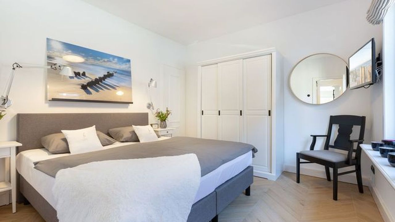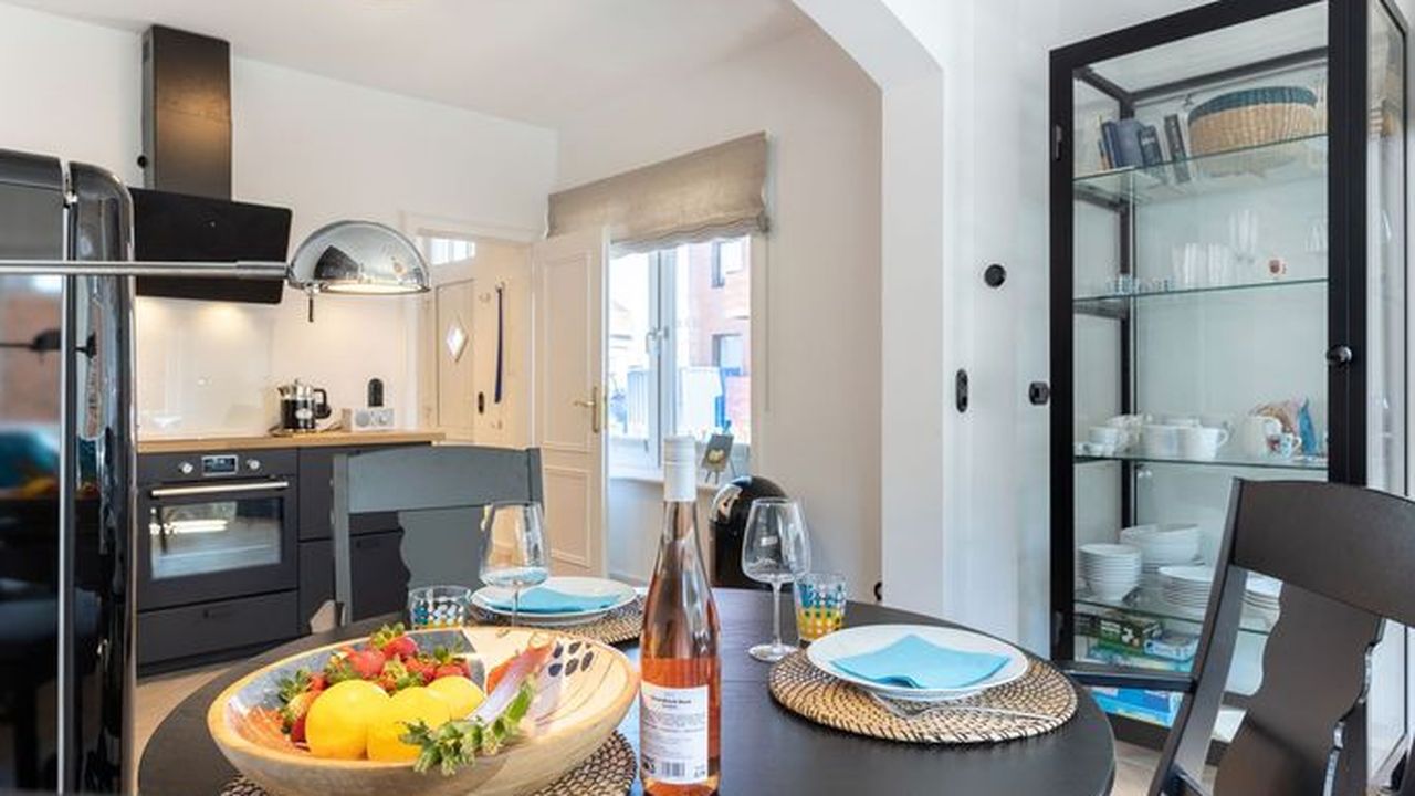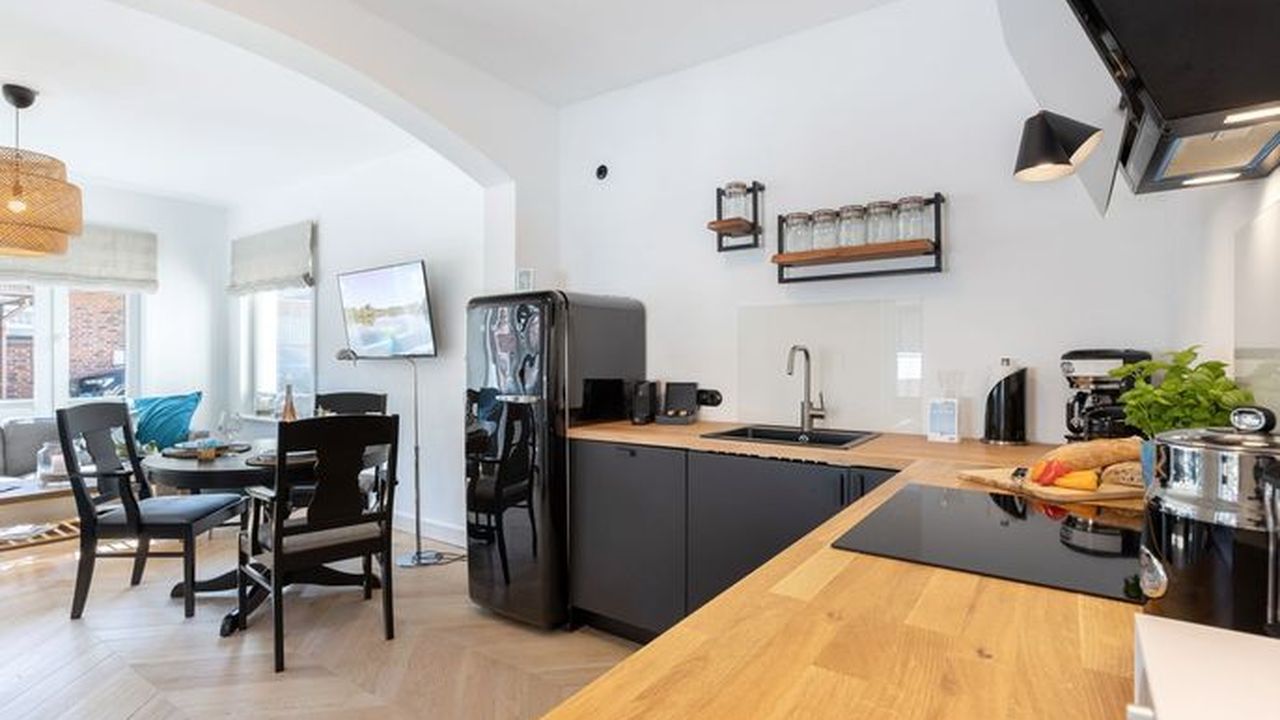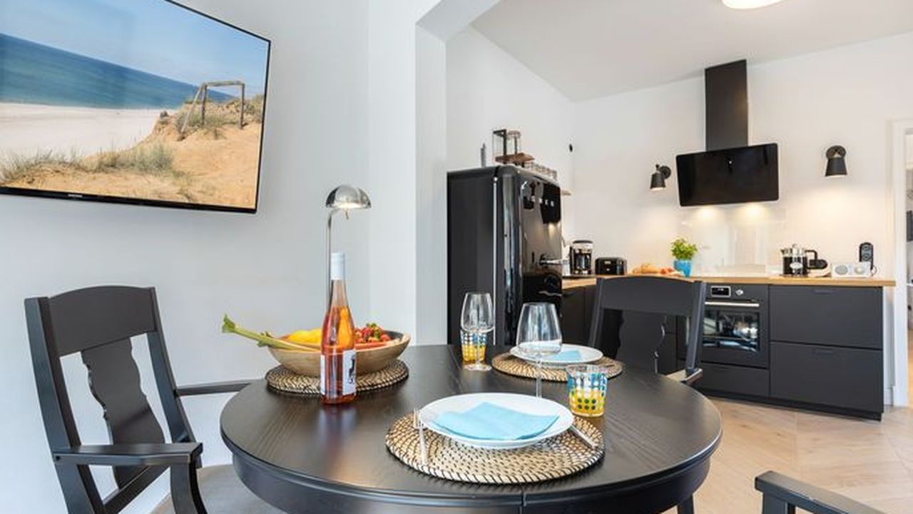 Bei der Einrichtung von Achtern wurde besonderen Wert auf geschmackvolles und bequemes Mobiliar gelegt, es gibt ein großes Boxspringbett, ein gemütliches Wohnzimmer, einen Esstisch und eine perfekt eingerichtete Küche mit Spülmaschine, Backofen und einem geräumigen Kühlschrank.