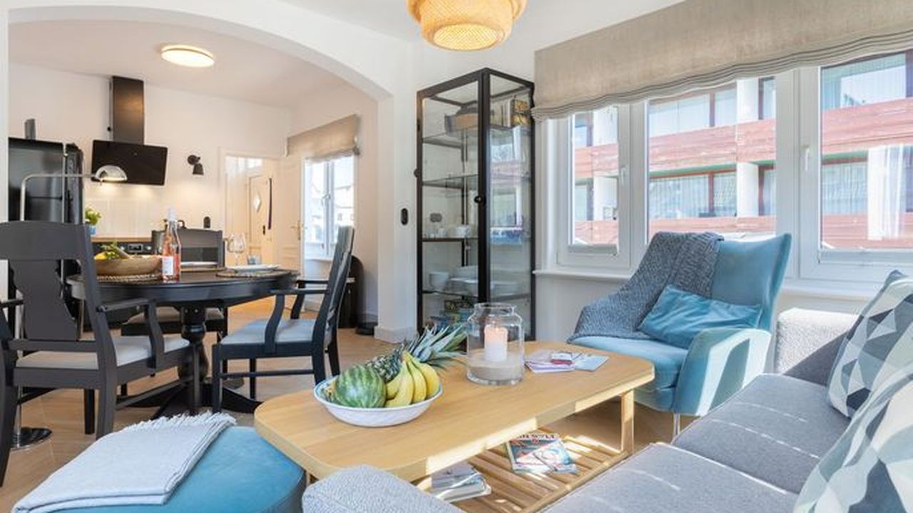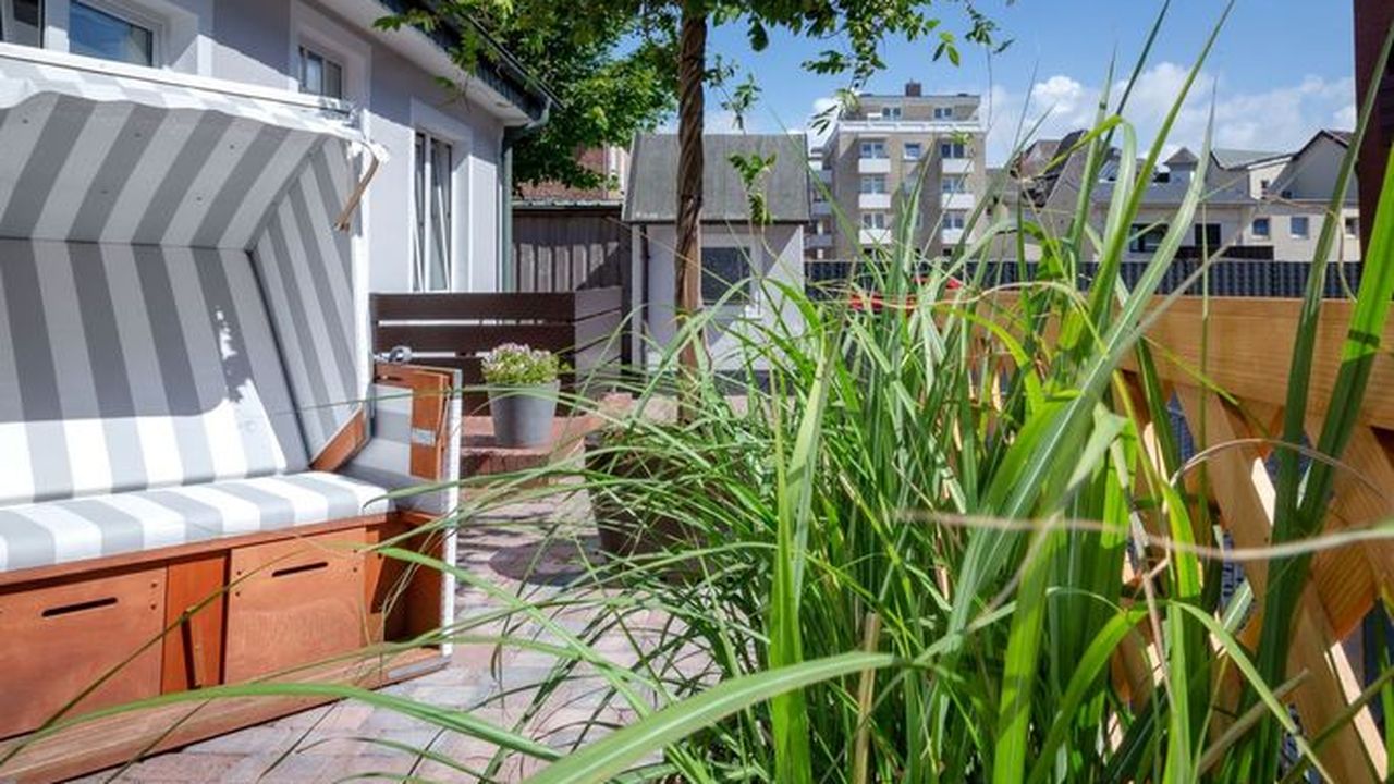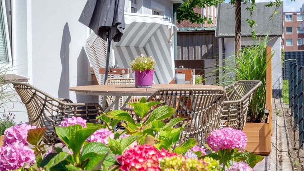 Zur Wohnung gehört im Außenbereich eine Terrasse mit Strandkorb und eine Essecke.