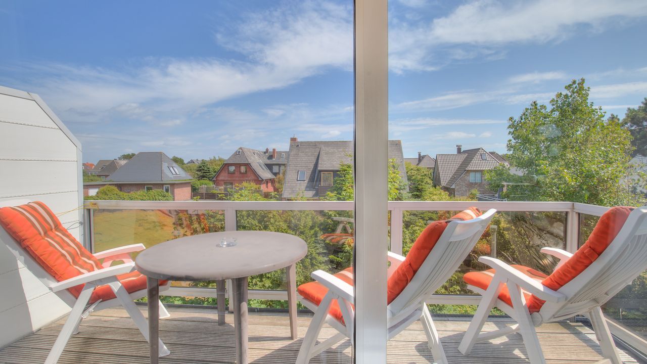 Der große Balkon mit Gartenmöbeln lädt zum Relaxen ein