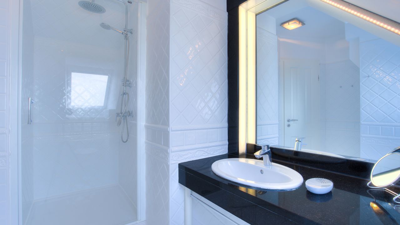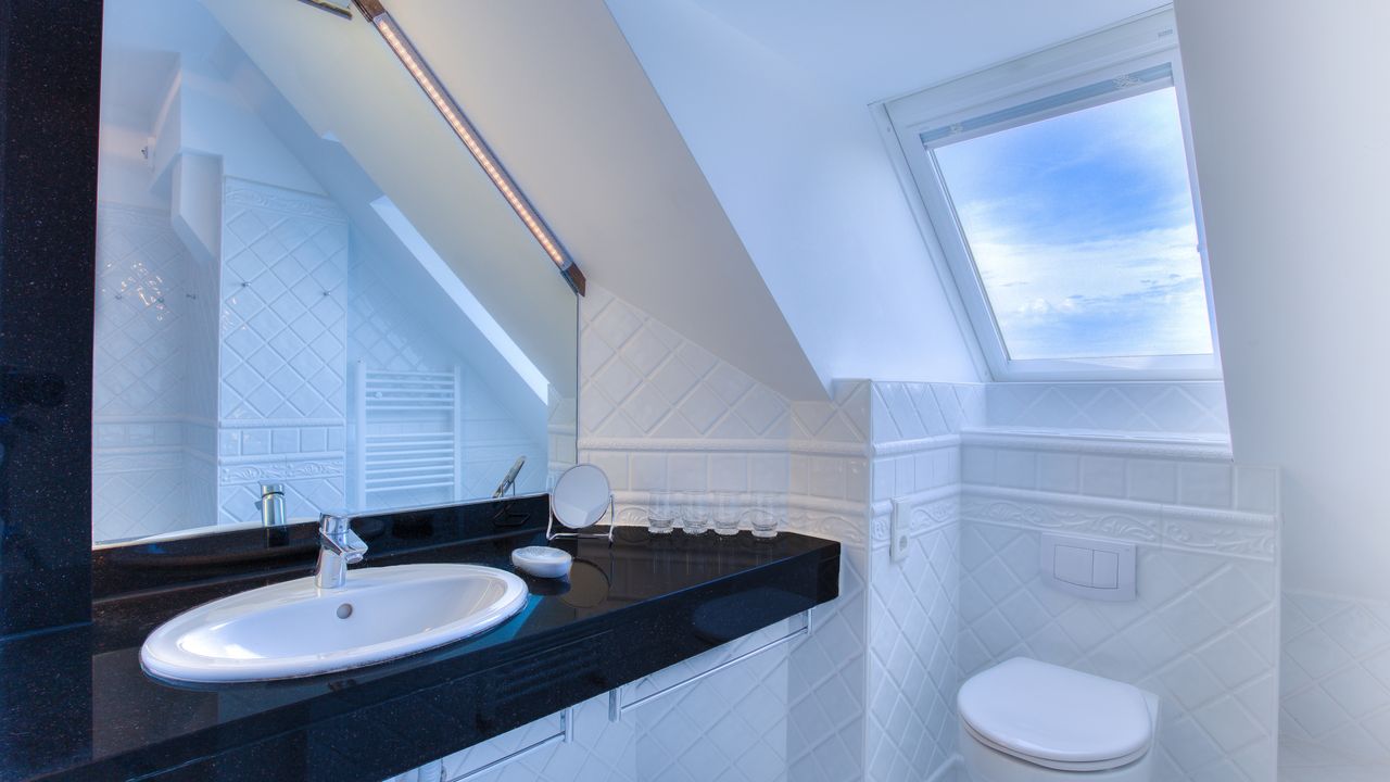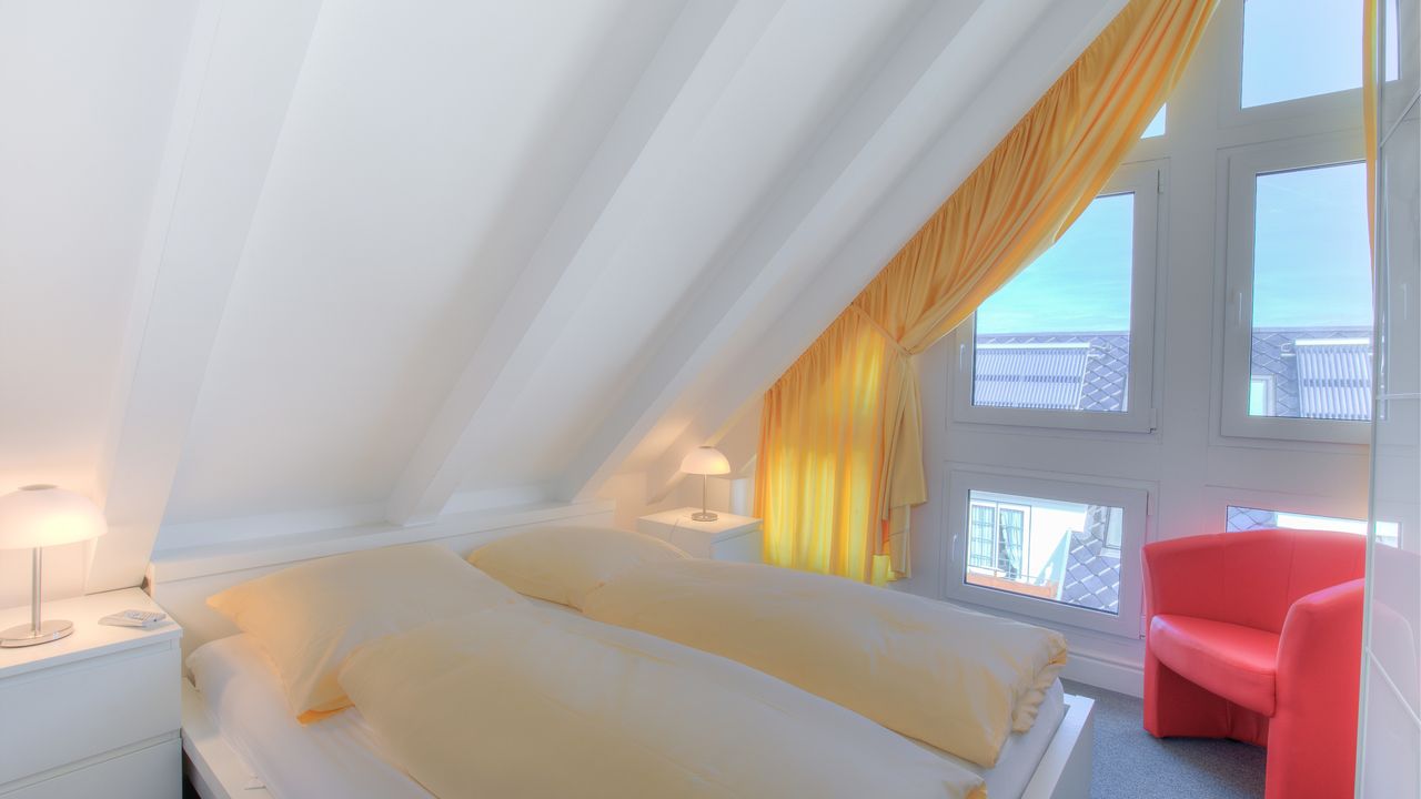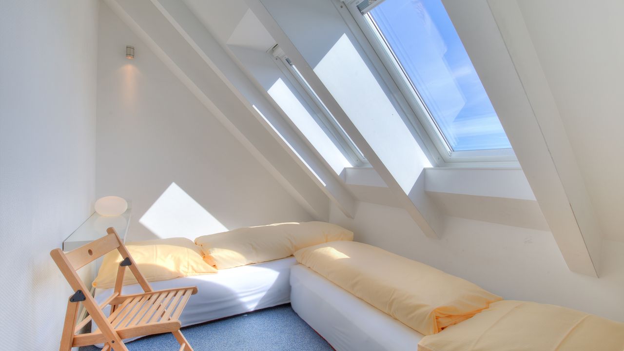 Beide Schlafzimmer (Doppelbett und Einzelbetten) sowie das Duschbad befinden sich oberhalb des Wohnzimmers. Beide Räume sind durch eine gut begehbare Zimmerwendeltreppe miteinander verbunden.