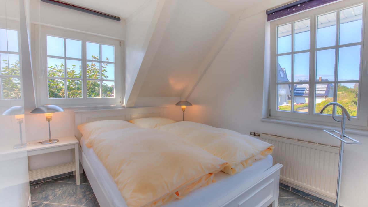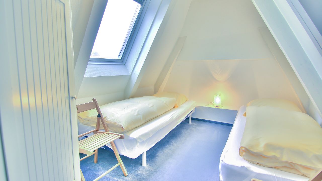 Unter Dachschrägen schlafen Sie entspannt in dem anderen Schlafzimmer mit Doppelbett und Fernseher. Für die Kleinen gibt es ein schönes Kinderzimmer mit zwei Einzelbetten. Zudem befindet sich auf dieser Ebene das zweite Duschbad.