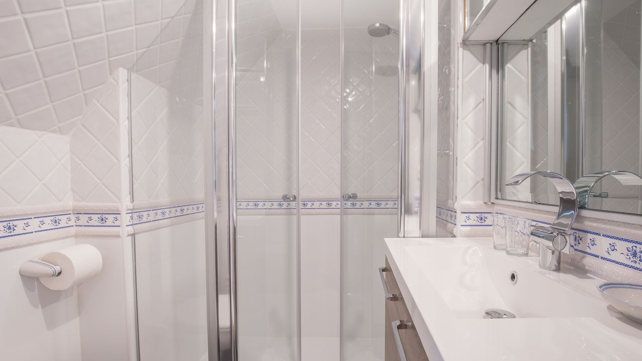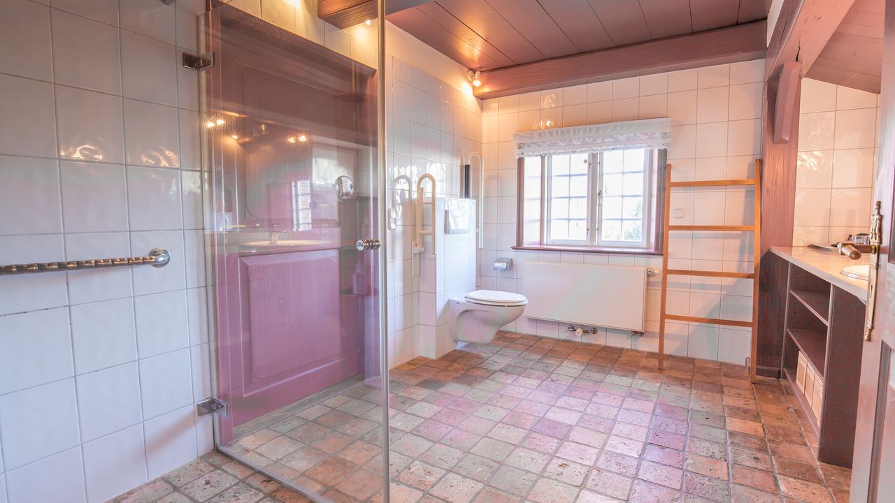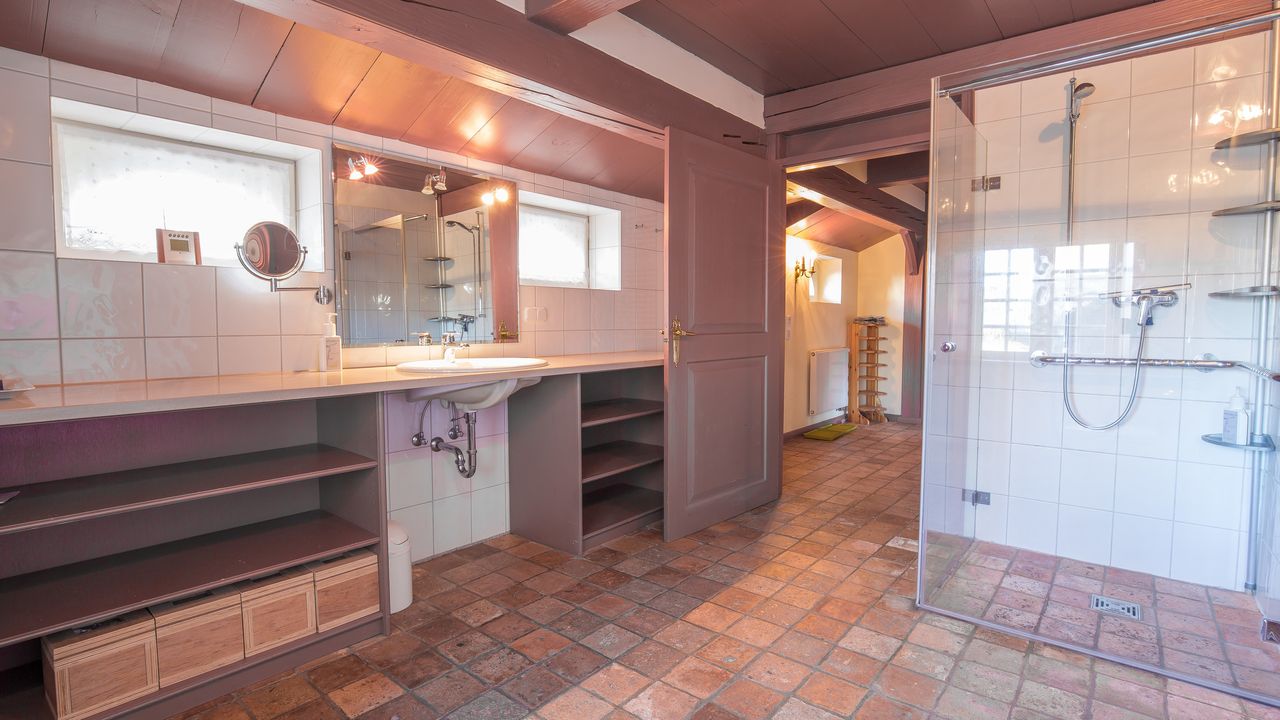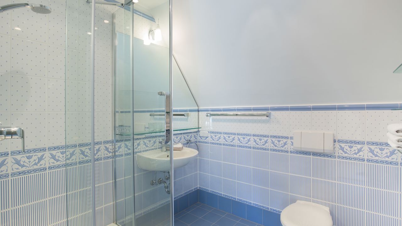 Ebenfalls im Erdgeschoss befindlich sind das große behindertengerechte Duschbad und das behagliche Doppelschlafzimmer mit Blick auf den ruhigen Terrassenbereich. Über die gut begehbare Treppe erreichen Sie zwei weitere Schlafzimmer mit jeweils eigenem Duschbad.