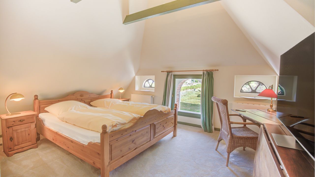 Etwas ganz Besonderes ist das nach friesischen Vorbildern gestaltete Schlafzimmer im Erdgeschoss, welches durch Schiebeelemente von dem Wohnzimmer getrennt ist und einen tollen Blick auf den abgeschiedenen Gartenbereich erlaubt. Weiterhin befindet sich ein schönes Duschbad mit Fenster im Erdgeschoss.
