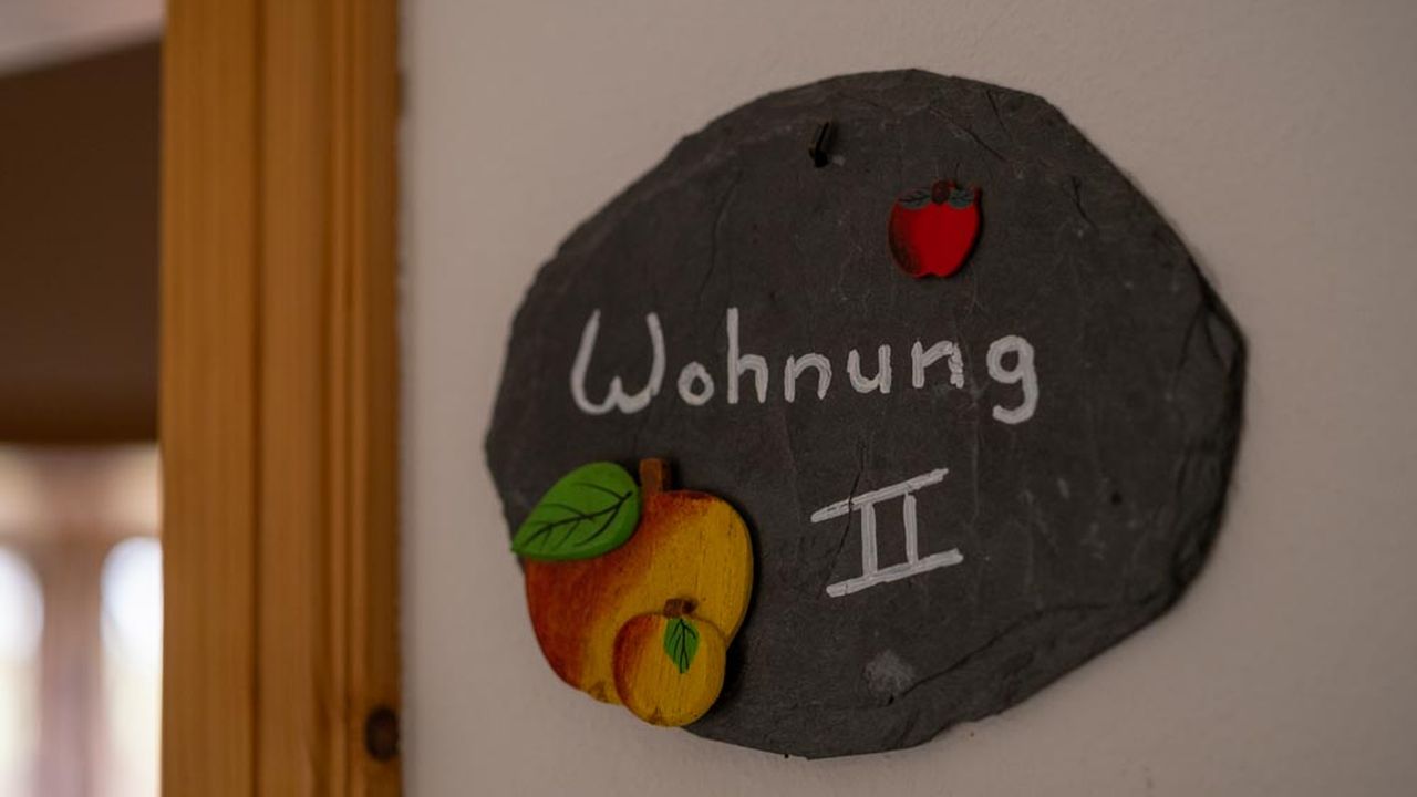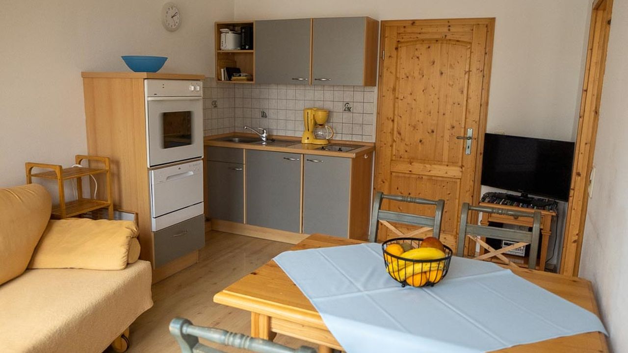 Diese Wohnung (35m²) liegt im 1. Stock und hat einen schönen Blick direkt auf unseren schönen Obstgarten und den darunterliegenden Teich mit den Gänsen. Sie hat ein Schlafzimmer mit Doppelbett, die Lattenroste sind im Kopfteil höhenverstellbar, ein Wohnzimmer, Küchenzeile, Dusche / WC mit Fenster. Die Küche ist komplett ausgestattet mit Geschirr, Töpfen und Besteck, einen Geschirrspüler, Kaffeemaschine, Kühlschrank mit Gefrierfach, Herd, Backofen, Toaster und Wasserkocher.Beschreibung der Unterkunft