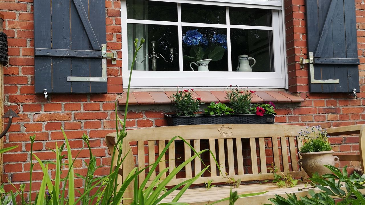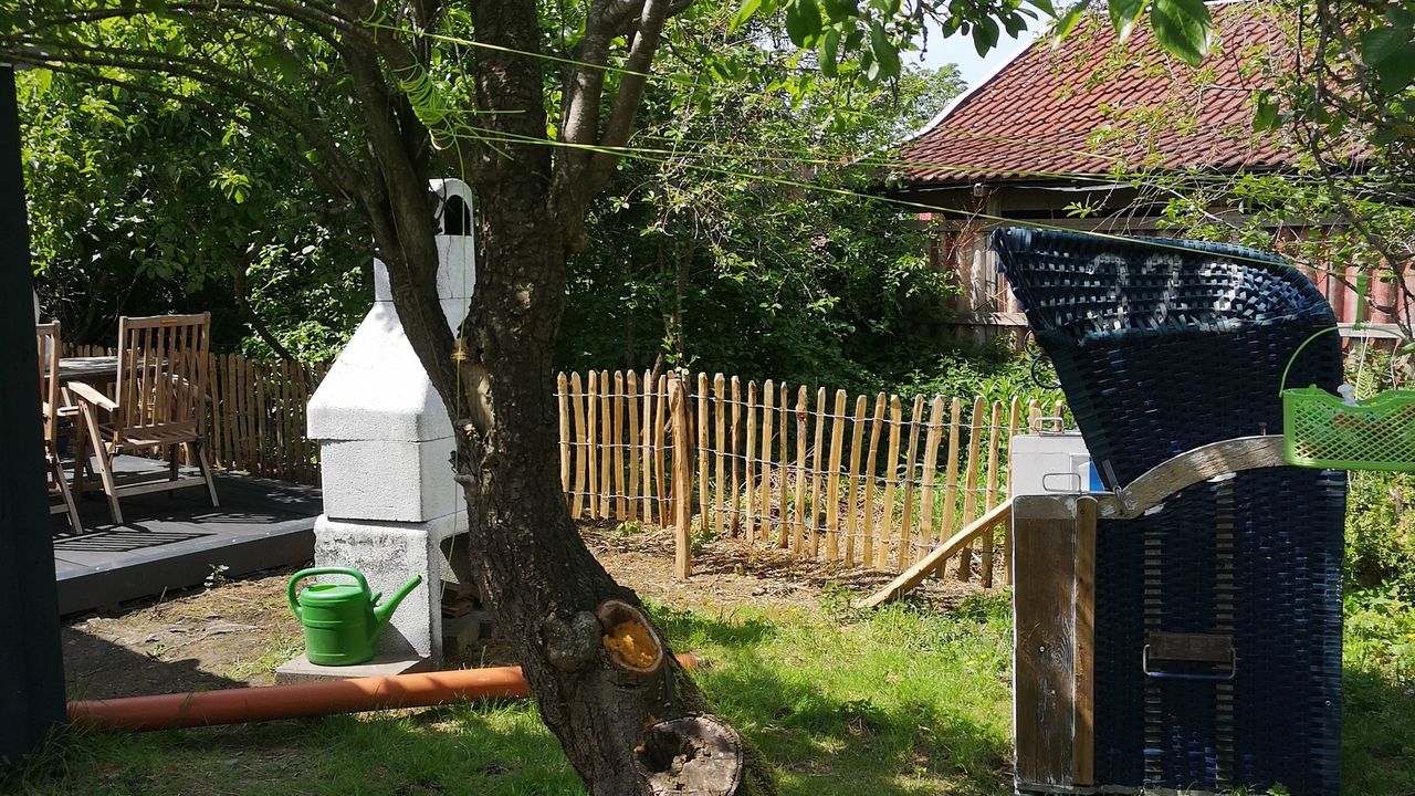 Im Garten haben wir ein massives Gartenhaus das ausgestattet ist mit einem Kaminofen, und einem Ostfriesensofa. Holz müssen sie sich vor Ort kaufen und können dann Abends auf dem Ostfriesensofa vor dem Kamin sitzen.