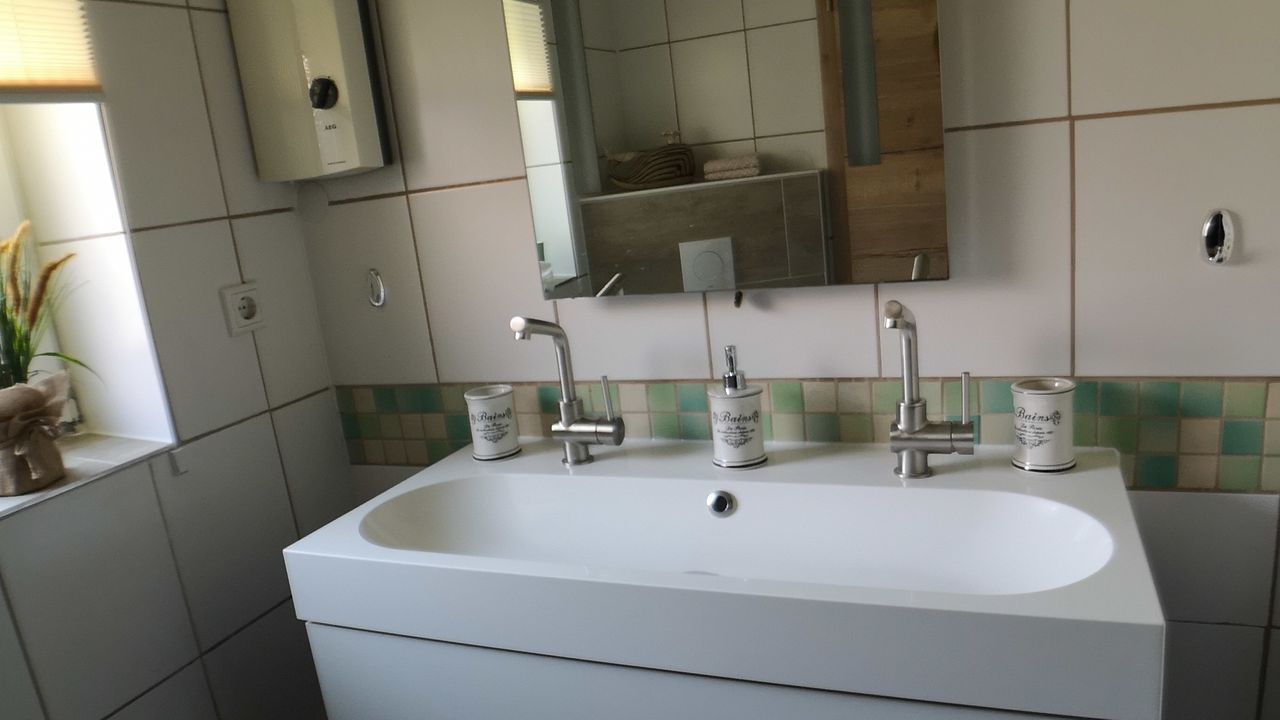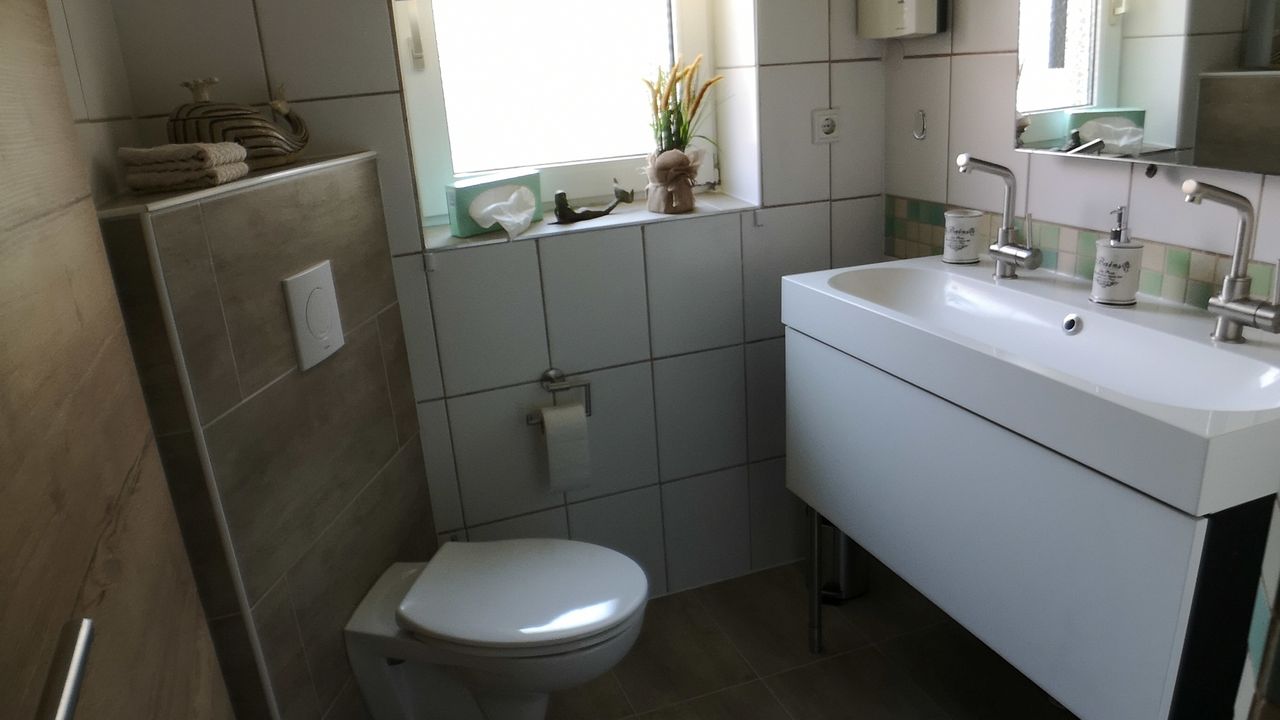Das Bad hat ein Doppelwaschbecken und ist mit Handtüchern ausgestattet. Das Schlafzimmer hat ein großes Doppelbett in 180x200 cm , Bettwäsche in 155x220cm und einen Fernseher.