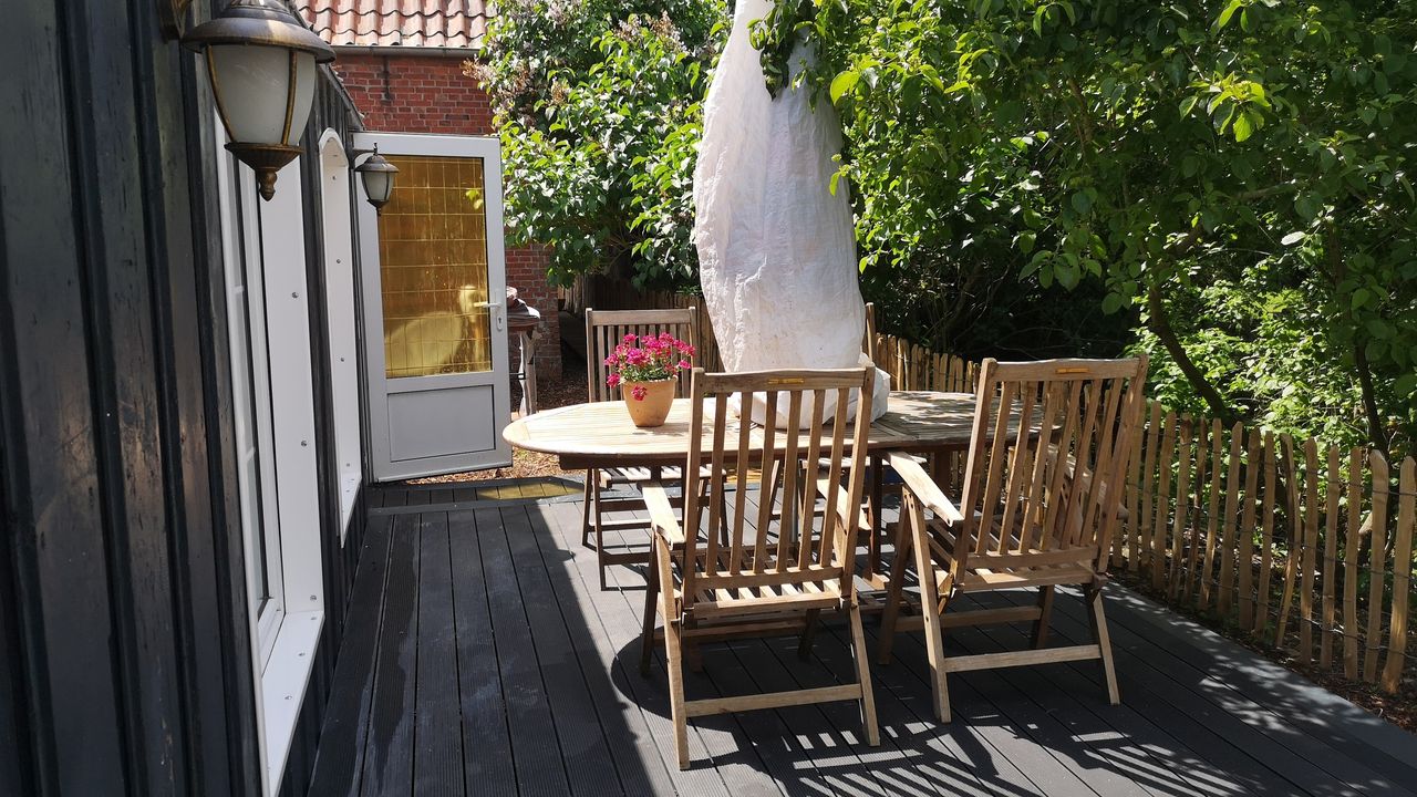 Vor dem Gartenhaus ist unsere Terrasse, die ausgestattet ist mit einem echten Nordsee Strandkorb und einer Tischgruppe aus Teakholz. Einen Grill haben wir auch für Sie.