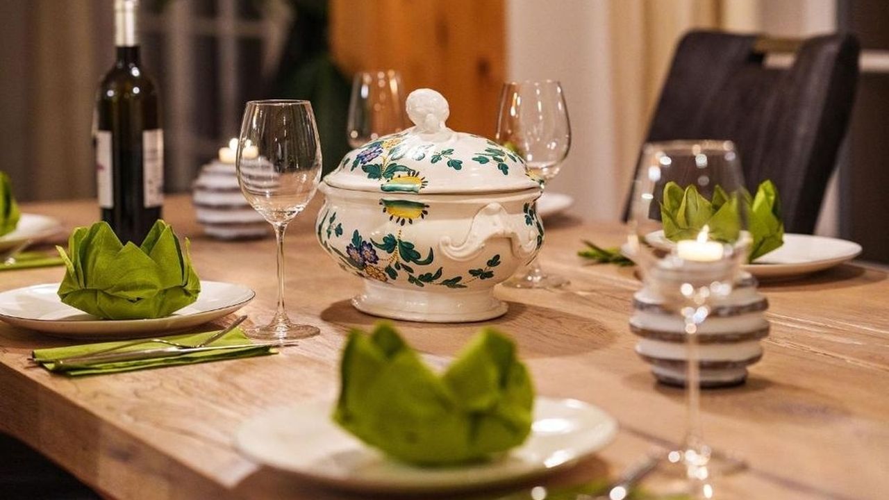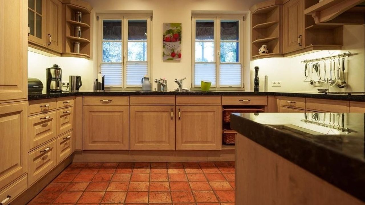 Die Küchenkombination ist modern und die Küche ist vollausgestattet. Es gibt drinnen und draußen einen großen Esstisch, die gerne auch für Spiele genutzt werden.