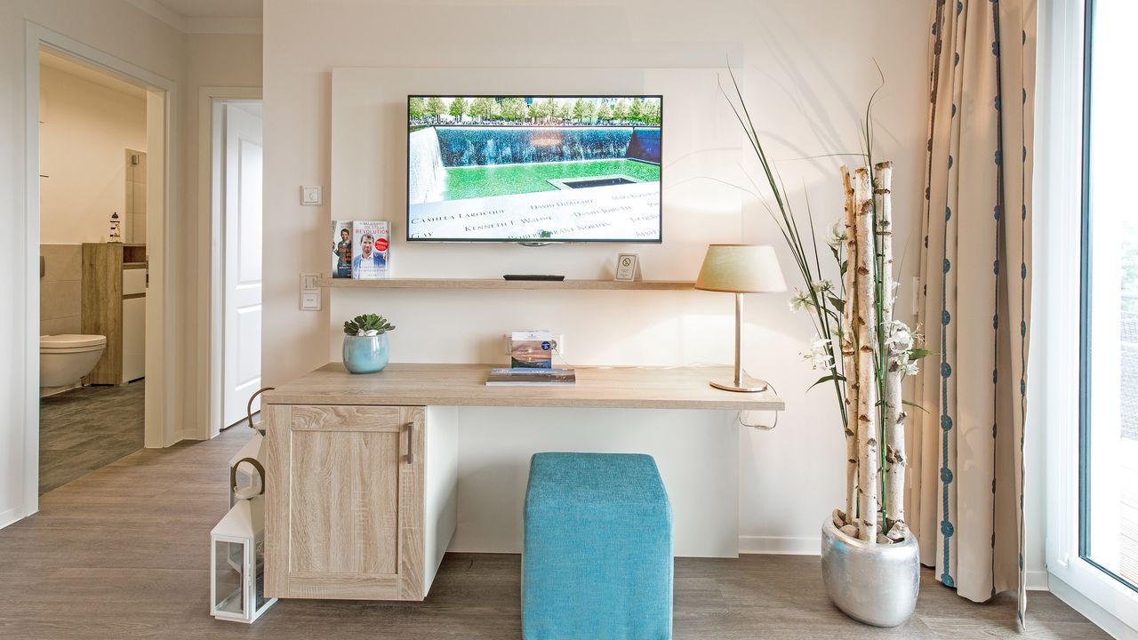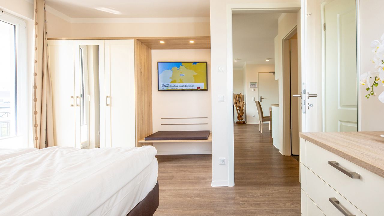 Das Apartment 2-50 befindet sich im zweiten Obergeschoss vom im Juli 2018 eröffneten Waterkant Suites Hotel. Die 2-50 gehört zu den grössten Zweiraumapartments im Objekt. Zusätzlich zum 1,80 m breiten Boxspringbett im Schlafzimmer haben Sie im Wohnzimmer ein komfortables sogenanntes Längsschläfersofa mit einer Schlaffläche von 1,60 x 1,95 m.. Auch ausgeklappt haben Sie noch ausreichend Platz im Wohnbereich.