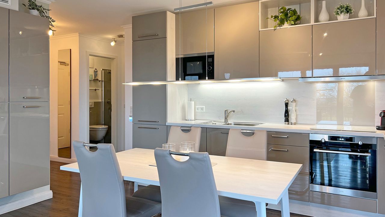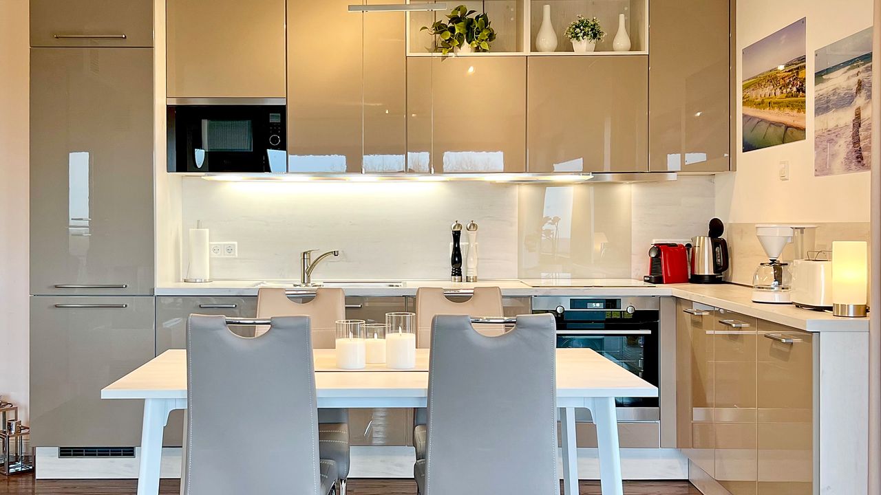NEUE EINBAUKÜCHE mit Backofen und 4-flammigem Ceranfeld, Geschirrspüler, Kühlschrank mit Gefrierfach, Mikrowelle, Kaffeemaschine, Nespressomaschine, Wasserkocher und Toaster. Sie haben ausreichende Abstell- und Unterbringungsmöglichkeiten