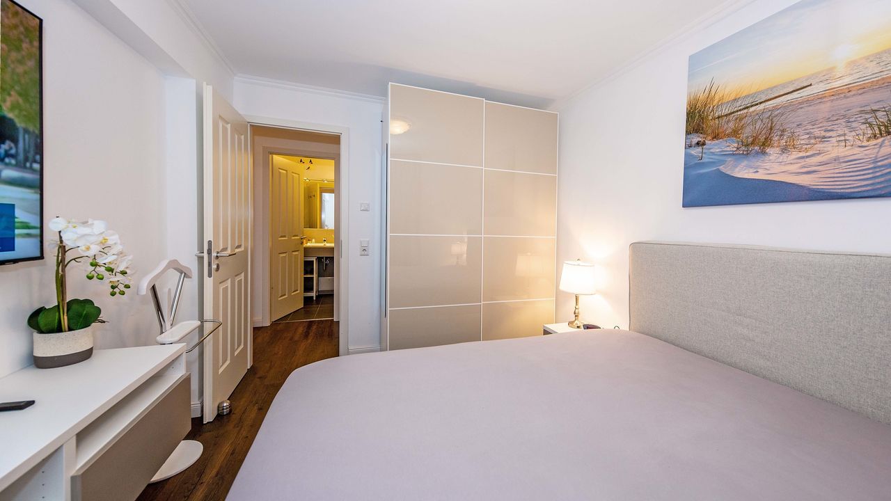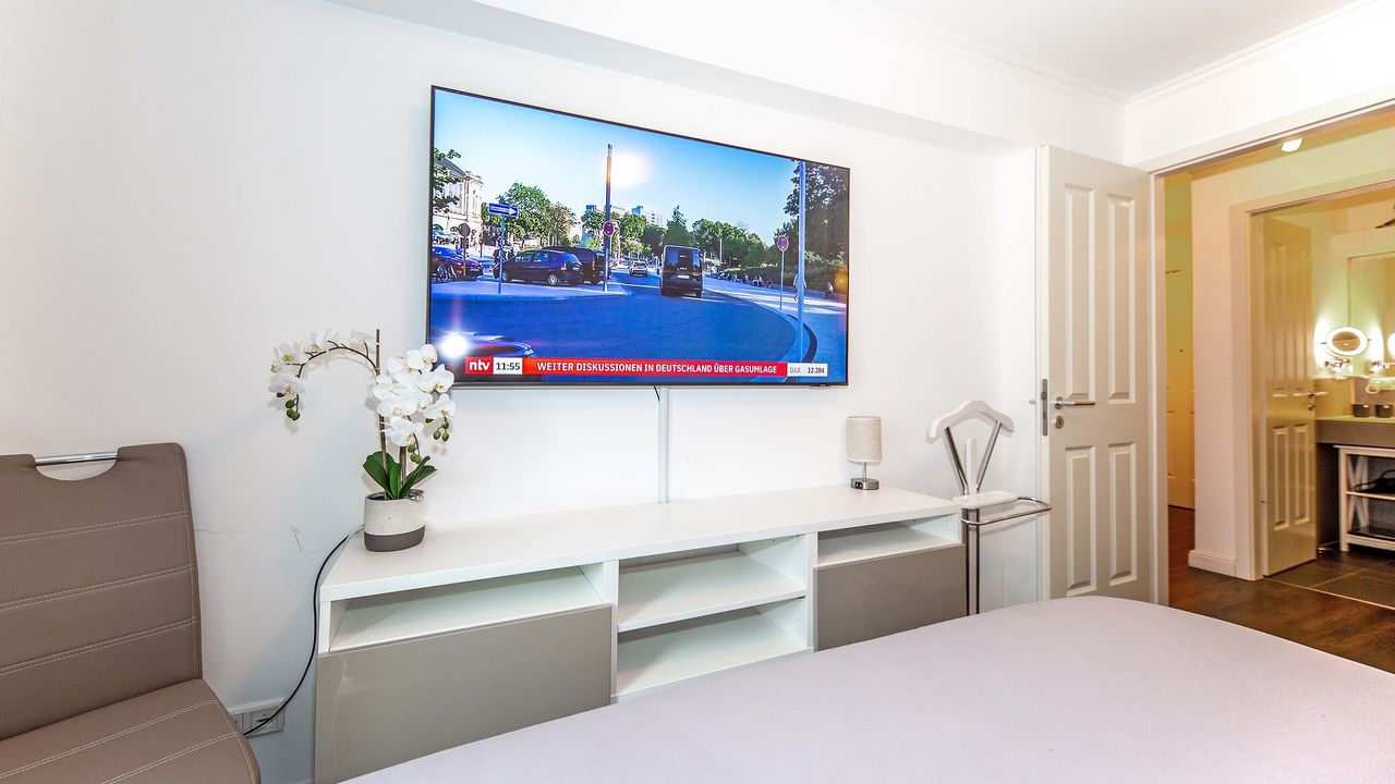 SCHLAFZIMMER, ein modernes Boxspringbett mit durchgehender Matratze von 1,80 x 2,00m und zusätzlichem Topper für bequemen Schlafkomfort, Kleiderschrank mit Ganzkörperspiegel und eine Wandkommode, darüber ein moderner 65 Zoll TV.