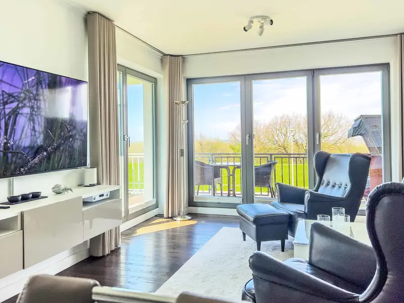 Direkter traumhafter MEERBLICK. Liebevoll eingerichtetes Zweiraumapartment mit Balkon in der ersten Reihe. DIREKT am MEER und nur wenige Meter zum Strand. Ein Highlight ist die lichtdurchflutete Fensterfront mit Blick auf die Ostsee und teils atemberaubenden Sonnenuntergängen. Der Eckbalkon mit Strandkorb, ein geschlossener Kamin, zwei grosse TV's, ein modernes Bad mit bodengleicher Dusche, ein kostenloser TG-PKW-Stellplatz und Fahrstuhl sind weitere Highlights..Beschreibung der Nachbarschaft