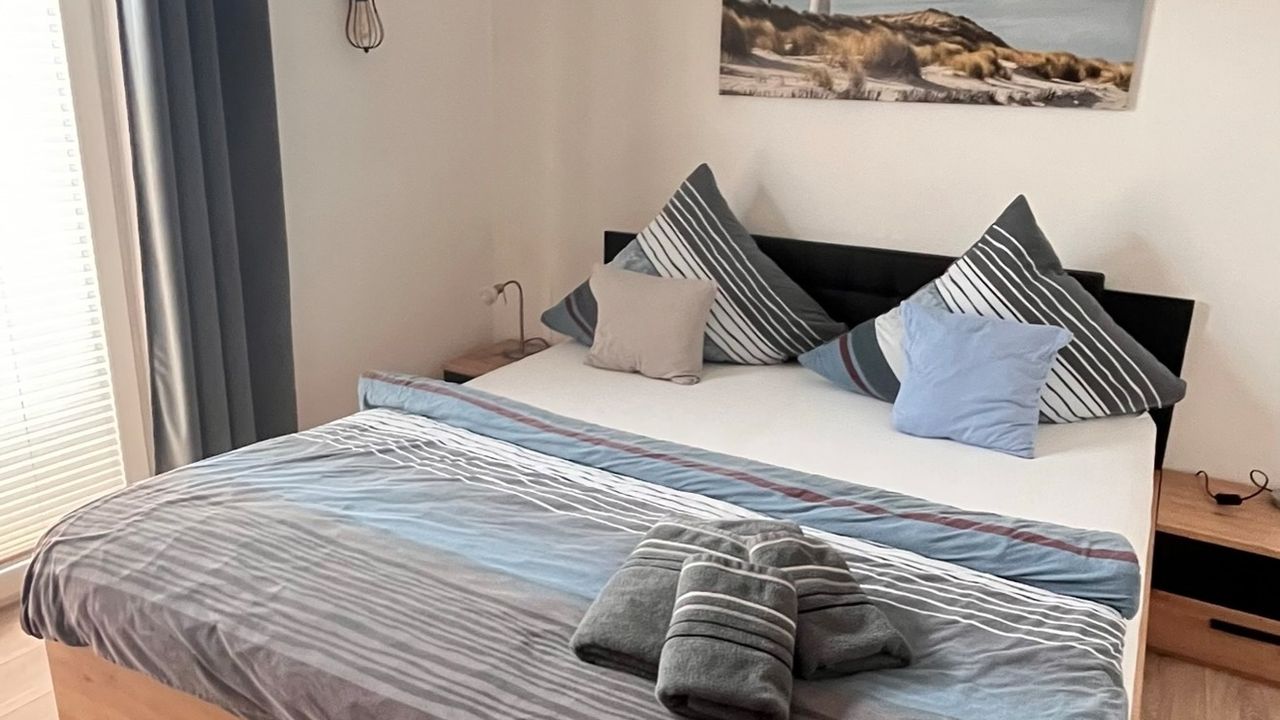 Unsere Ferienwohnung befindet sich im Erdgeschoss vom Huus Borkum. Sie betreten die Wohnung und gelangen in den gemütlichen Wohn- Essbereich mit einer kleinen angrenzenden Küche. Über einen kleinen Flur gelangen Sie in das großzügige Schlafzimmer welchen mit einem komfortablem Doppelbett ausgestattet ist. Hieran befindet sich auch das Badezimmer mit einer Dusche. Ein eigener Parkplatz steht Ihnen direkt vor dem Haus zur Verfügung.Herzlich Willkommen im Huus Borkum.