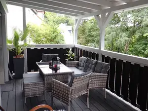 Das eingezäunte, am Hang liegende, Grundstück der komplett eingerichteten 60qm Ferienwohnung mit einer Wunderschönen Überdachten Terrasse zum entspannen, befindet sich direkt am Stadtrand und hat durch den Garten direkten Zugang zum Wald.