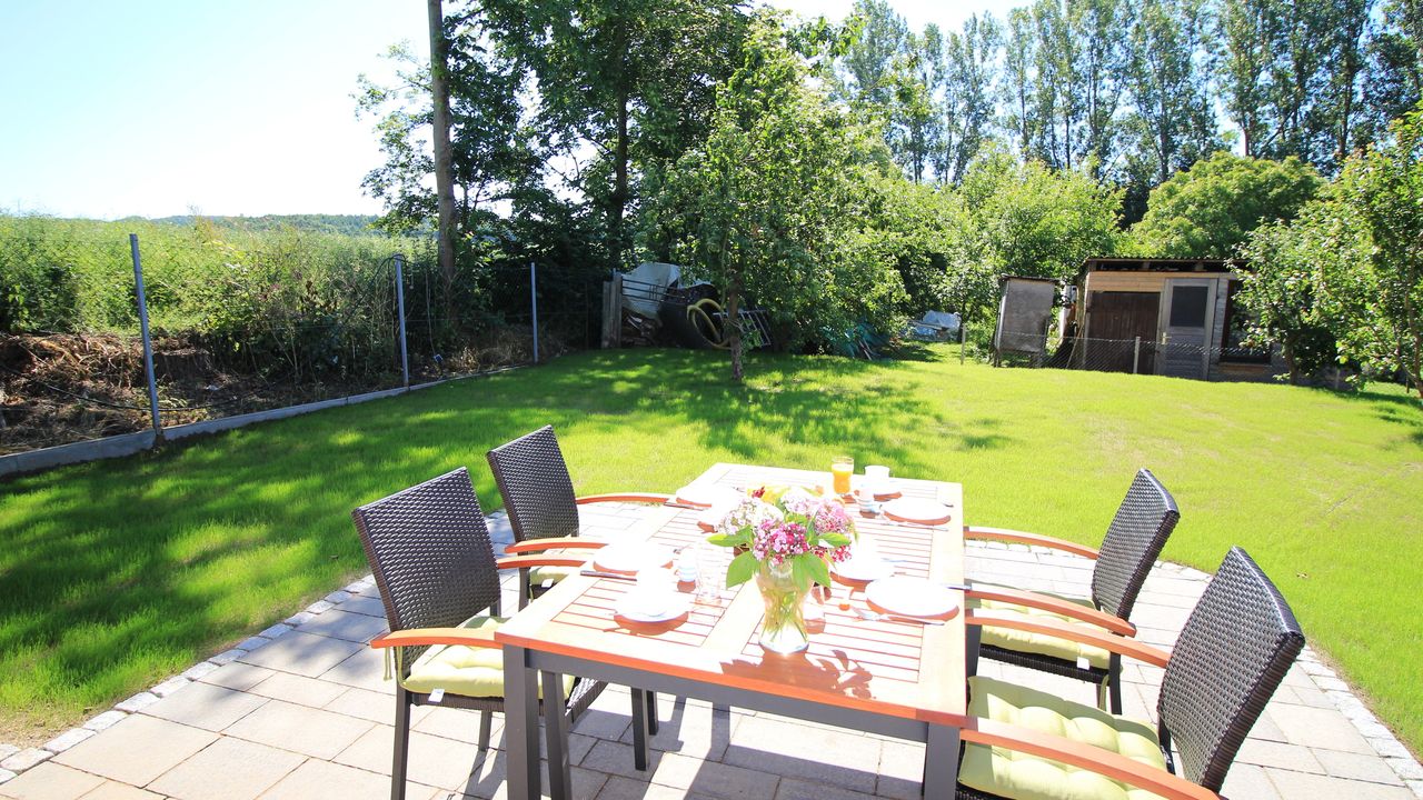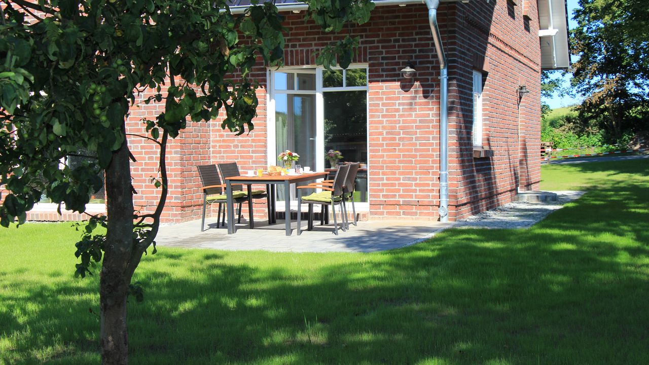 Zur Ferienwohnung gehört eine Terrasse mit Gartenmöbeln und Grill. Auf dem Grundstück befindet sich ein Spielplatz mit Trampolin, Schaukel und Rutsche.