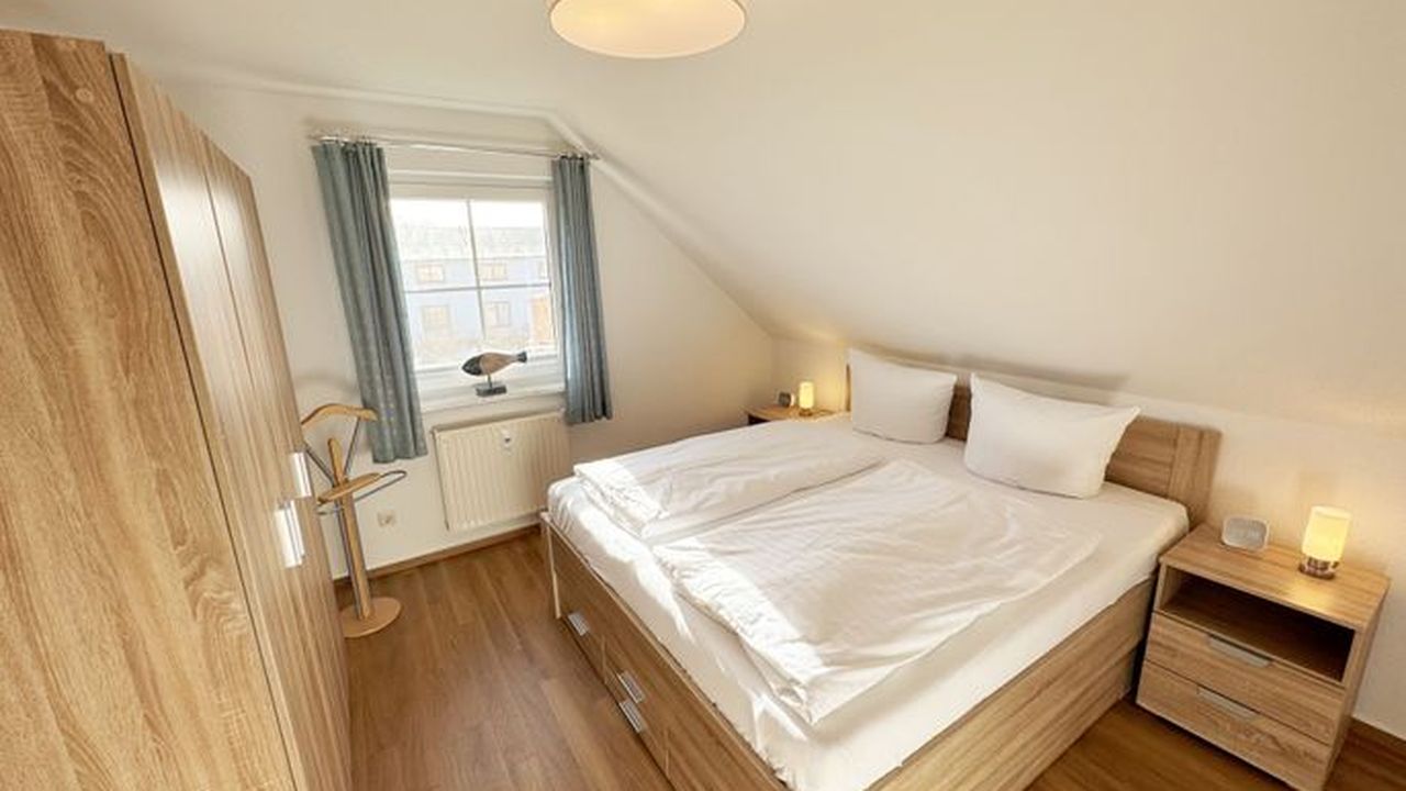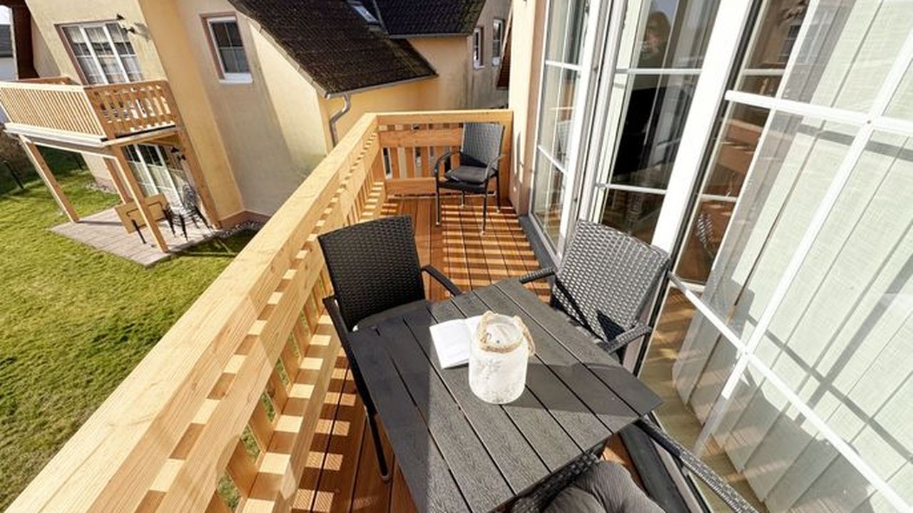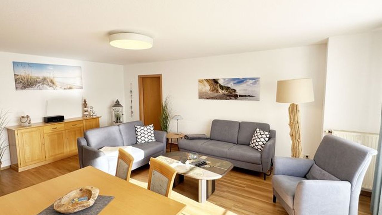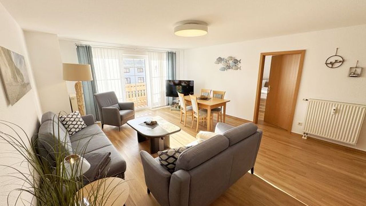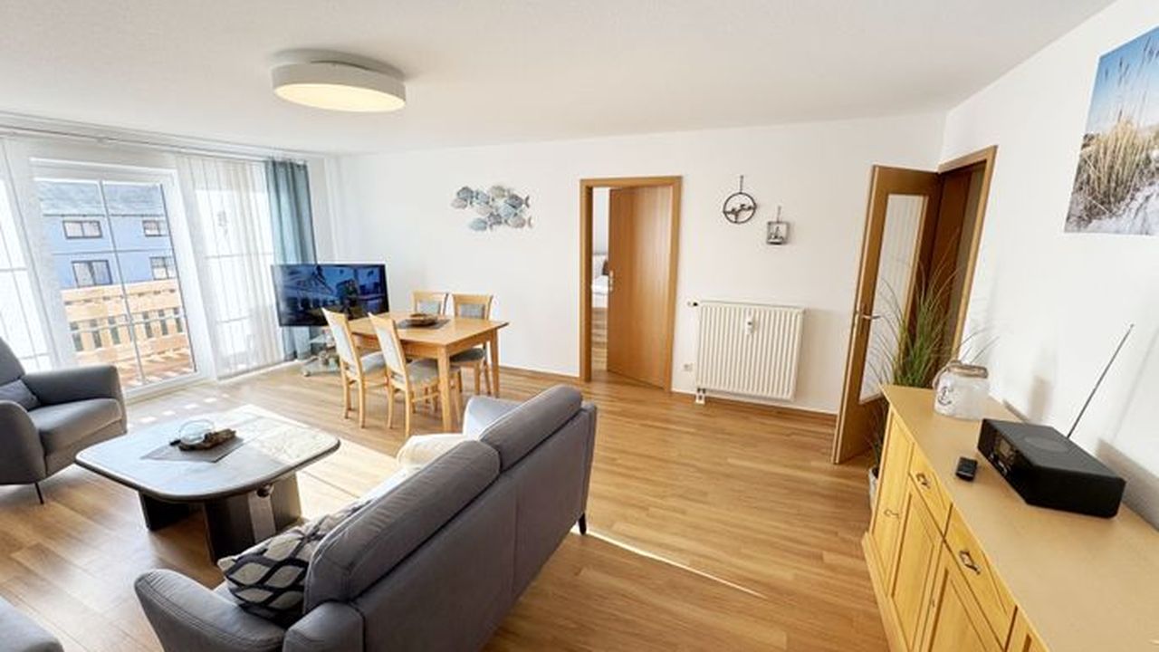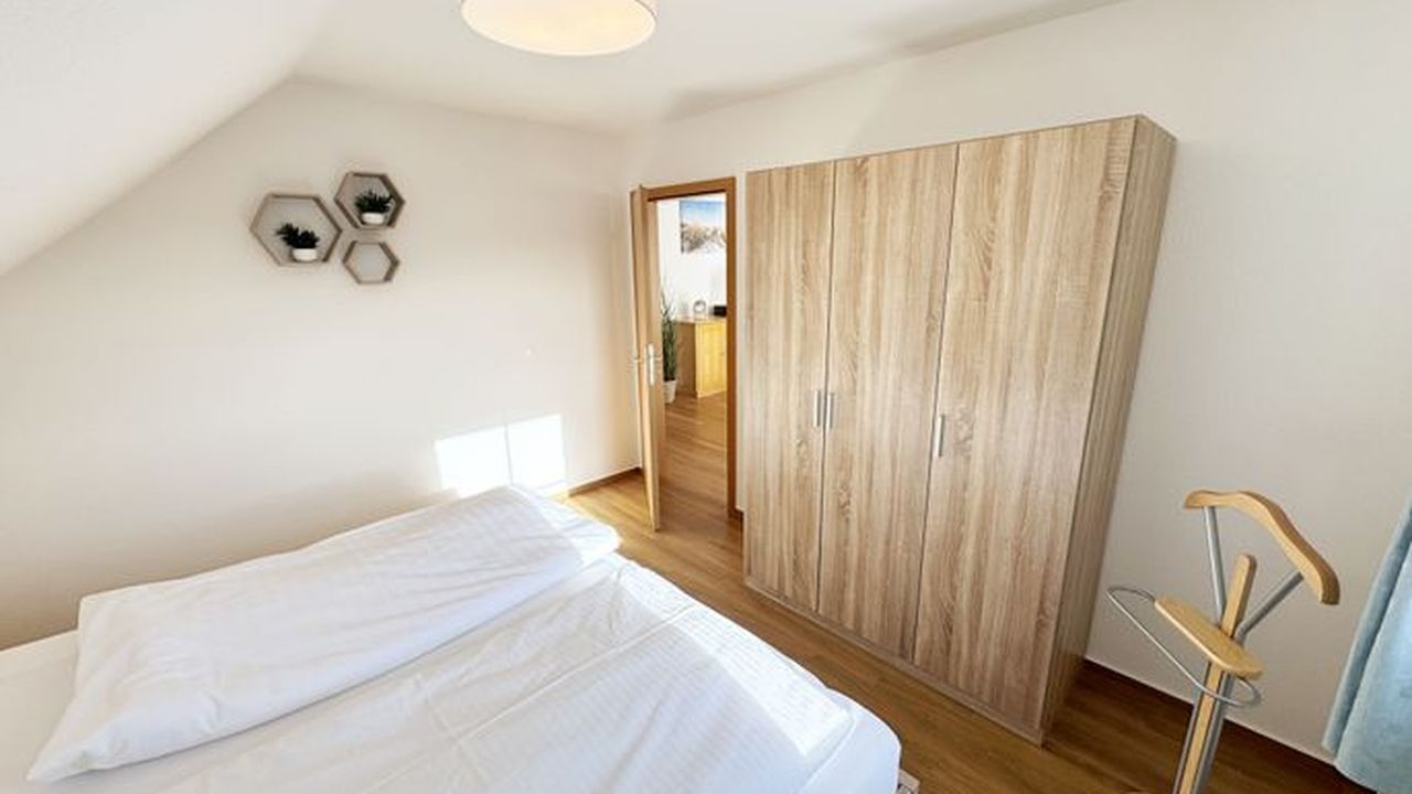 Die mit 87 m² komfortable eingerichtete Nichtraucherwohnung befindet sich in der 1. Etage und bietet ausreichend Platz für max. 4 Erwachsene + 1 Kleinkind bis 3 Jahre im Kinderreisebett. Im großzügigen Wohnbereich laden ein 3-Sitzer, 2-Sitzer, ein Sessel, ein Couchtisch, eine Leselampe, Sideboard mit DAB-Radio sowie ein TV Board mit Smart-TV zum Verweilen ein. Ein Essplatz rundet den Wohnbereich ab. Auf dem bestuhlten Balkon mit Ostausrichtung gelangen Sie vom Wohnbereich. Beide Schlafzimmer sind mit je einem Doppelbett (2,00m x 2,10m & 2,00m x 2,00m), verstellbaren Lattenrosten, Nachttischablagen, Verdunklungsmöglichkeiten, Insektenschutzgitter und einen Kleiderschrank ausgestattet. Für die Gemütlichkeit sorgt in diesen beiden Zimmern ein Teppichboden. Die separate Küche verfügt einen Kühlschrank mit Eisfach, über ein Ceranfeld, mit Abzugshaube, einen Backofen, Geschirrspüler, Kaffeemaschine, Wasserkocher, Toaster, diverse Küchenutensilien und einen kleinen Tisch mit Bestuhlung. Das Tageslicht-Bad ist mit einer Dusche, ein WC, ein Waschtisch und einen Fön ausgestattet. Im kleinen Abstellraum befinden sich Reinigungsutensilien, ein Bügelbrett und Bügeleisen sowie ein Wäscheständer. Für unsere kleinen Gäste ist ein Hochstuhl und Kinderreisebett inklusive vor Ort. Ein Parkplatz befindet sich direkt am Haus und steht Ihnen kostenfrei zur Verfügung. Ihre mitgebrachten oder geliehenen Fahrräder können Sie auf dem Grundstück abstellen. Haustiere sind nicht erlaubt. Die Erstausstattung eines Wäschepaketes (komplette Bettwäsche, 1 Duschhandtuch, 2 kleine Handtücher) können Sie bis 14 Tage vor der Anreise gegen einen Aufpreis dazu buchen oder durch eigene ergänzen. Ab 2 gebuchten Paketen erhalten Sie einmalig 1 Geschirrtuch und einen Duschvorleger dazu.Sonstiges