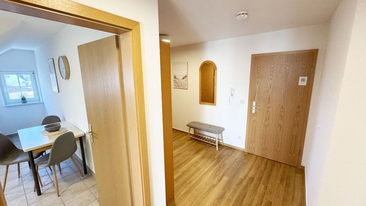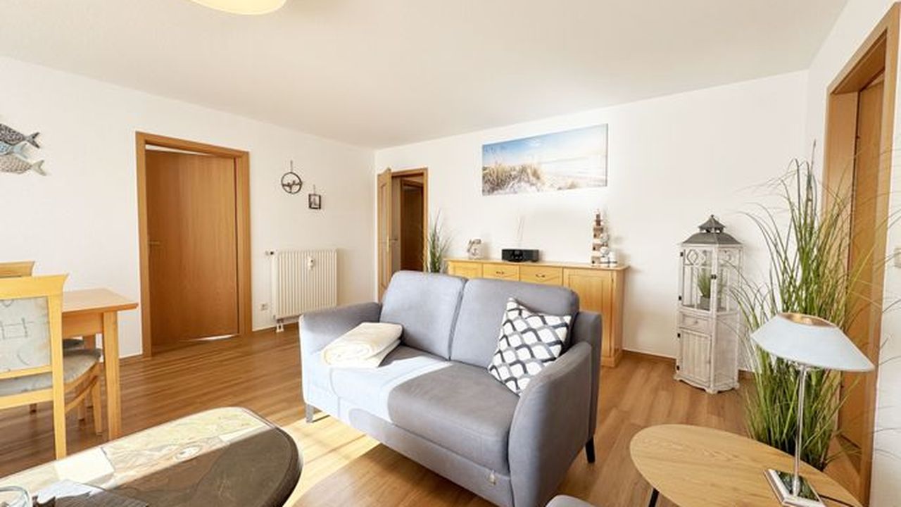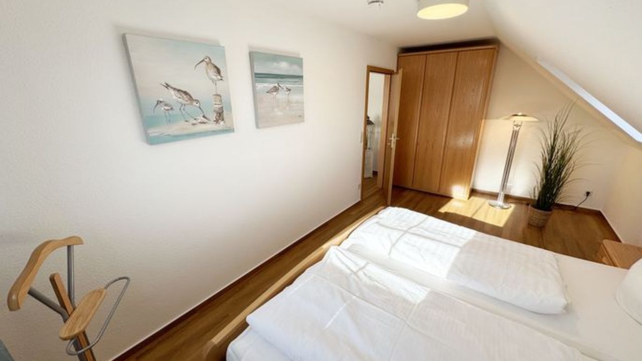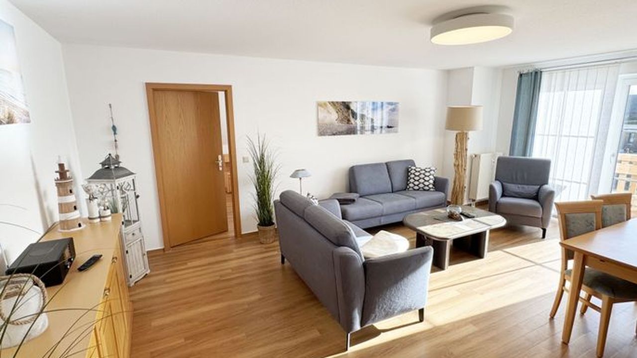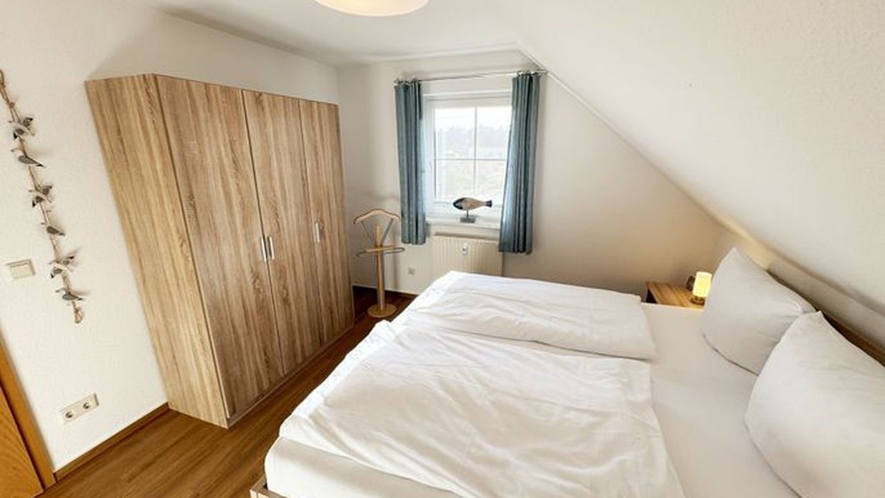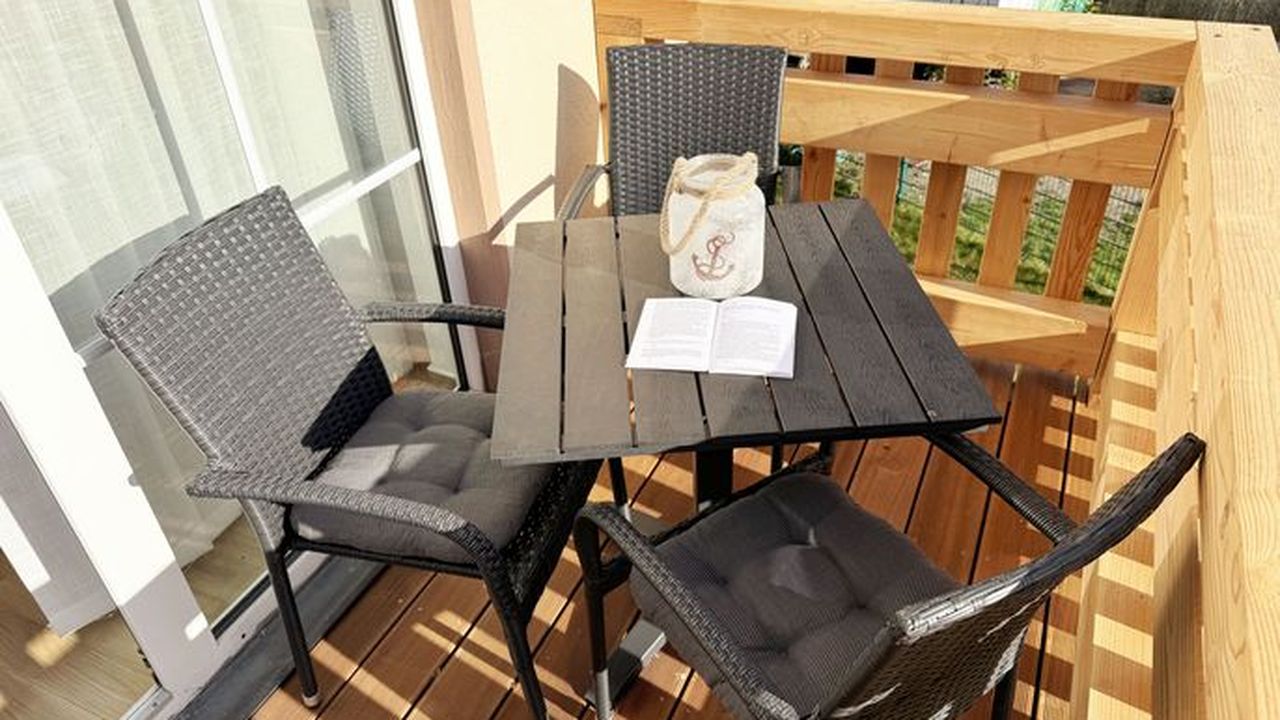 Die mit 87 m² komfortable eingerichtete Nichtraucherwohnung befindet sich in der 1. Etage und bietet ausreichend Platz für max. 4 Erwachsene + 1 Kleinkind bis 3 Jahre im Kinderreisebett. Im großzügigen Wohnbereich laden ein 3-Sitzer, 2-Sitzer, ein Sessel, ein Couchtisch, eine Leselampe, Sideboard mit DAB-Radio sowie ein TV Board mit Smart-TV zum Verweilen ein. Ein Essplatz rundet den Wohnbereich ab. Auf dem bestuhlten Balkon mit Ostausrichtung gelangen Sie vom Wohnbereich. Beide Schlafzimmer sind mit je einem Doppelbett (2,00m x 2,10m & 2,00m x 2,00m), verstellbaren Lattenrosten, Nachttischablagen, Verdunklungsmöglichkeiten, Insektenschutzgitter und einen Kleiderschrank ausgestattet. Für die Gemütlichkeit sorgt in diesen beiden Zimmern ein Teppichboden. Die separate Küche verfügt einen Kühlschrank mit Eisfach, über ein Ceranfeld, mit Abzugshaube, einen Backofen, Geschirrspüler, Kaffeemaschine, Wasserkocher, Toaster, diverse Küchenutensilien und einen kleinen Tisch mit Bestuhlung. Das Tageslicht-Bad ist mit einer Dusche, ein WC, ein Waschtisch und einen Fön ausgestattet. Im kleinen Abstellraum befinden sich Reinigungsutensilien, ein Bügelbrett und Bügeleisen sowie ein Wäscheständer. Für unsere kleinen Gäste ist ein Hochstuhl und Kinderreisebett inklusive vor Ort. Ein Parkplatz befindet sich direkt am Haus und steht Ihnen kostenfrei zur Verfügung. Ihre mitgebrachten oder geliehenen Fahrräder können Sie auf dem Grundstück abstellen. Haustiere sind nicht erlaubt. Die Erstausstattung eines Wäschepaketes (komplette Bettwäsche, 1 Duschhandtuch, 2 kleine Handtücher) können Sie bis 14 Tage vor der Anreise gegen einen Aufpreis dazu buchen oder durch eigene ergänzen. Ab 2 gebuchten Paketen erhalten Sie einmalig 1 Geschirrtuch und einen Duschvorleger dazu.Sonstiges