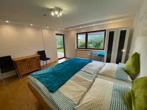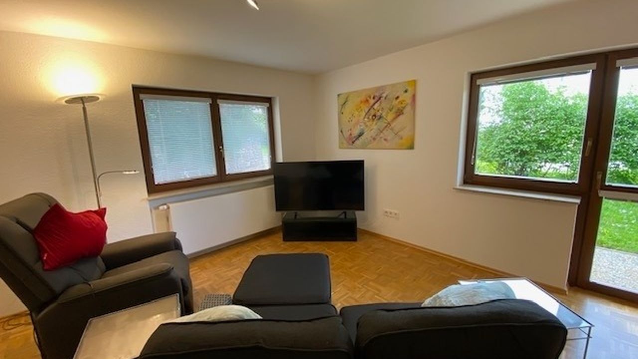 Wohnzimmer mit Flachbildschirm 55 Zoll, Essbereich, Schreibtisch, direkter Gartenzugang