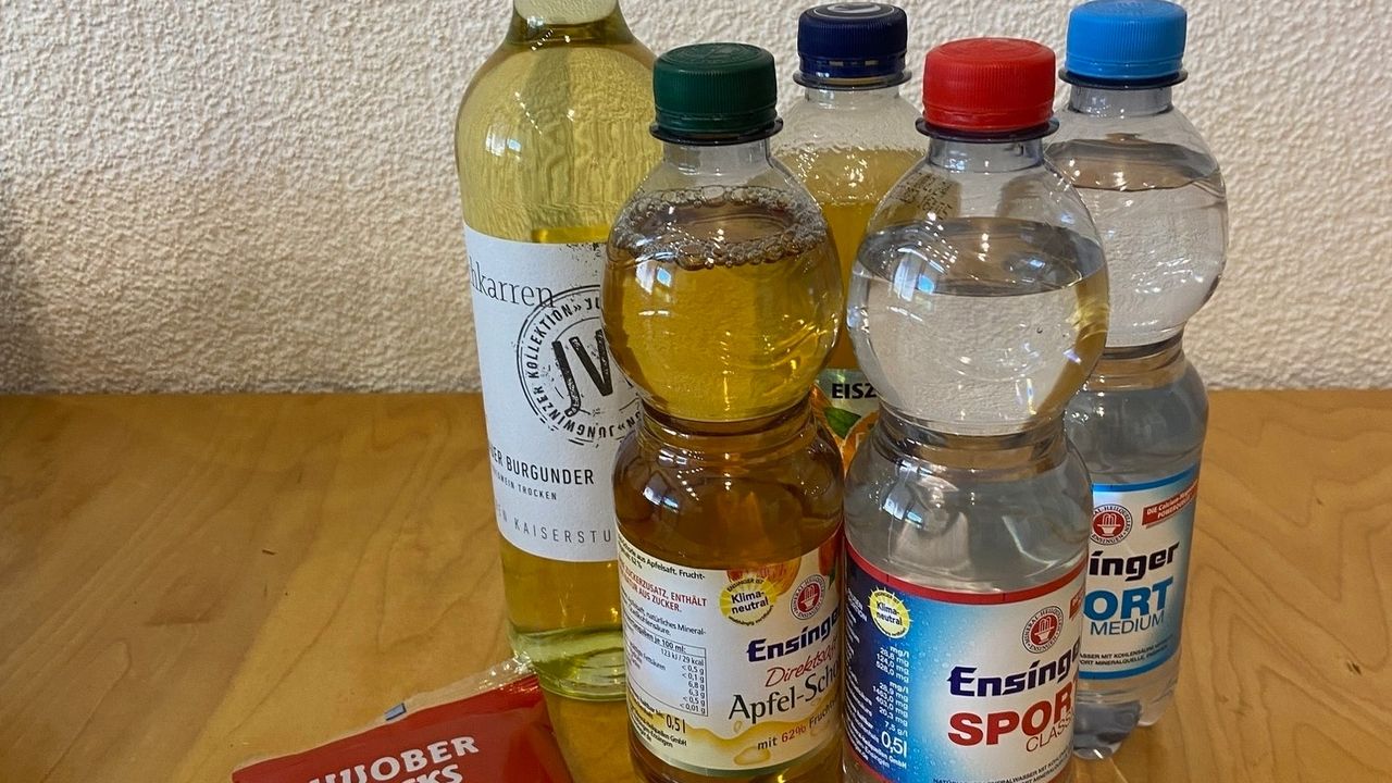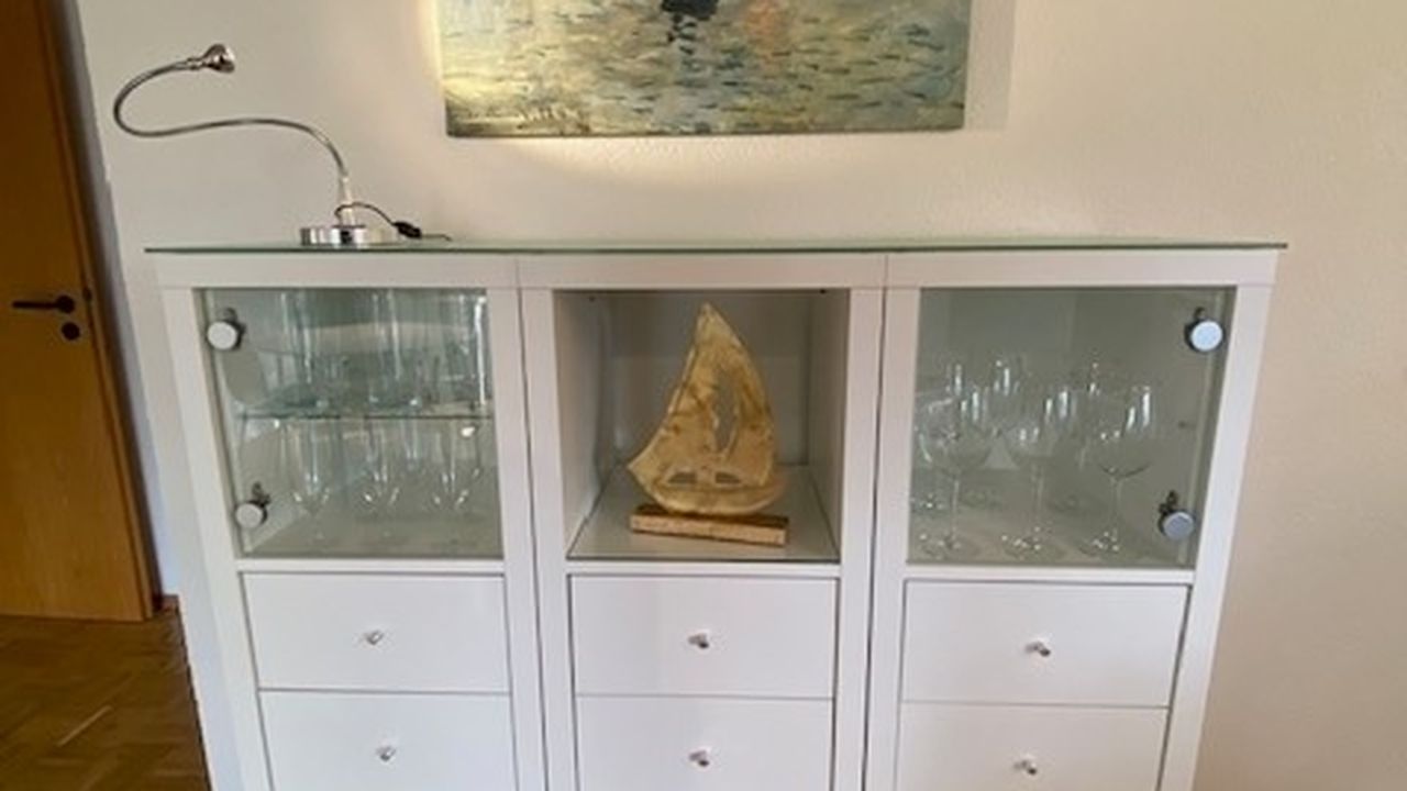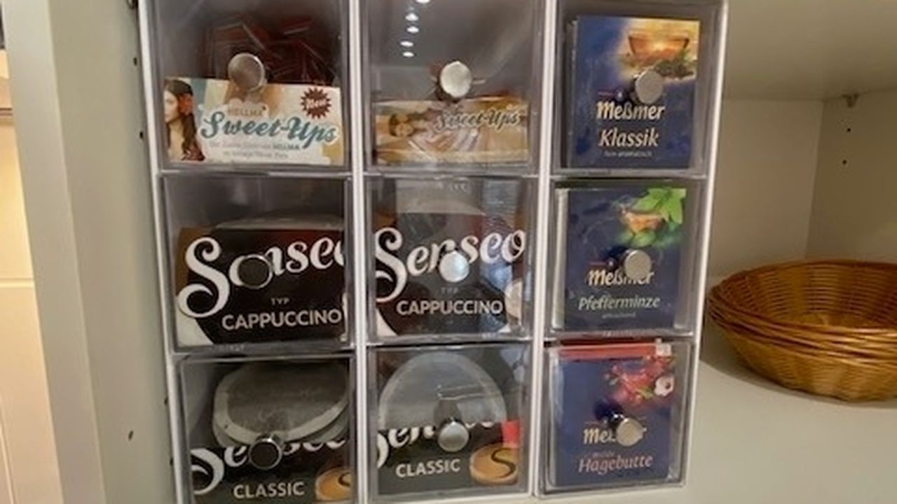 Begrüßungsgetränke im Kühlschrank und Salzgebäck, Kaffeepads drei Sorten, Tee drei Sorten Zucker + Kaffee Milch sowie Gewürze im Regal sind direkt in den Oberschränken
