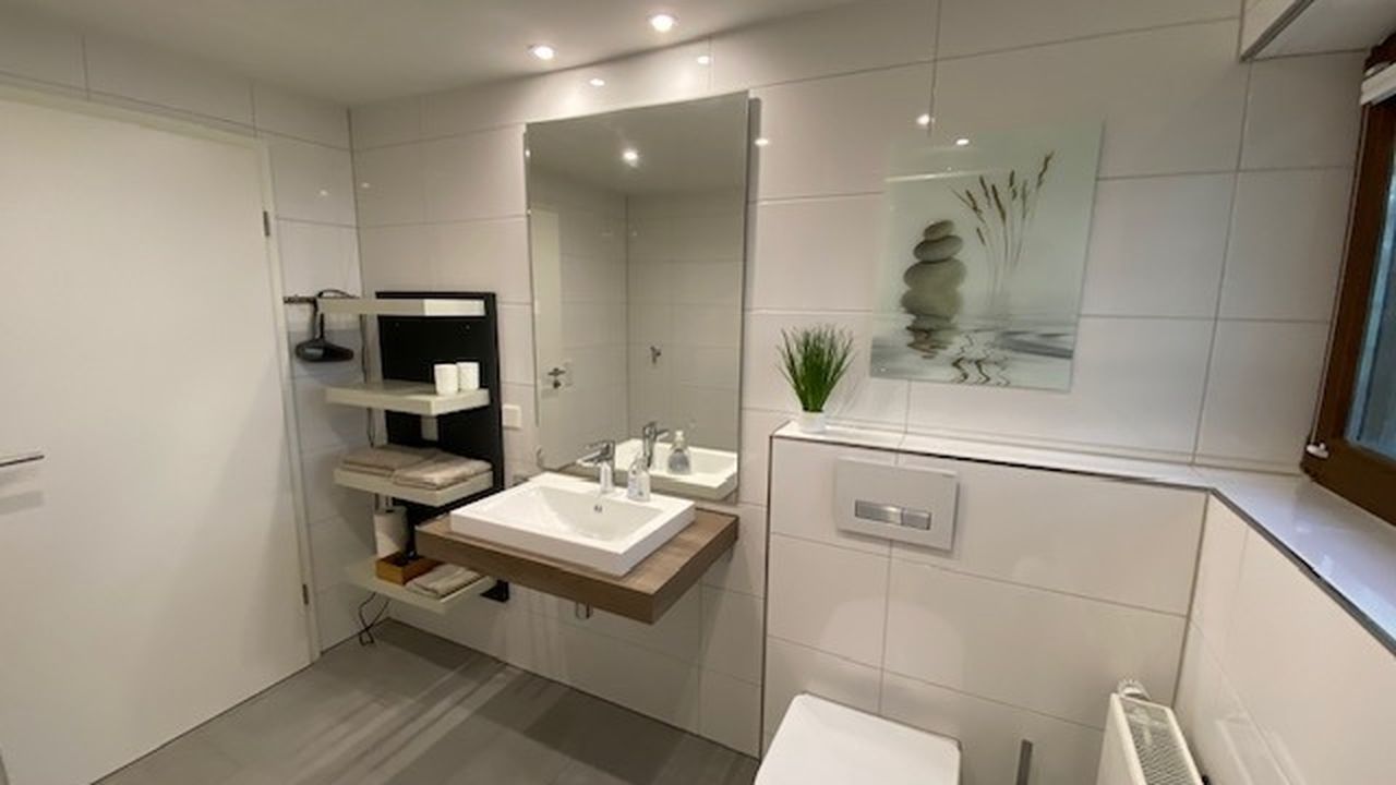 Badezimmer mit Haartrockner Ablagefächer, Dusch-/Hand-/ Bodentücher, Handwaschmittel