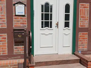 Die Ferienwohnung 1 liegt im Erdgeschuß und ist gut über die Eingangstreppe mit 3 Stufen von der Straßenseite oder über den Eingang vom Hof, auf dem das Auto parken kann, zu erreichen.