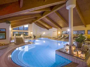 Alpine Wellness mit 4 Pools und 4 Saunen: Indoor|Outdoor 29°C, Hot Whirlpool 36°C, Kältepool 14 °C, Tiroler Schwitzstadl 90°C, Kräuter Bio Sauna 60°C, Dampfsauna 45°C, Infrarotkabine 37°C, Massageraum mit Bergblick