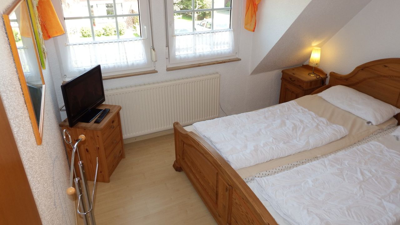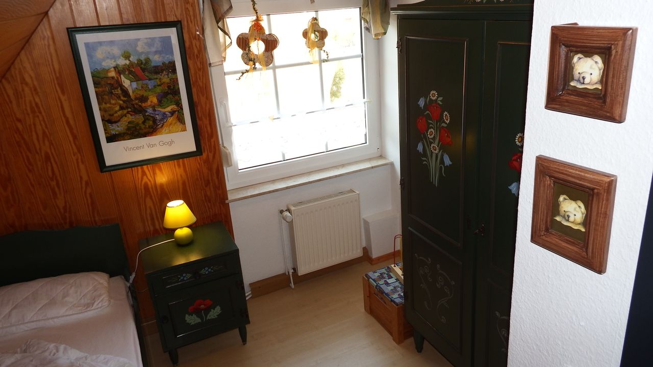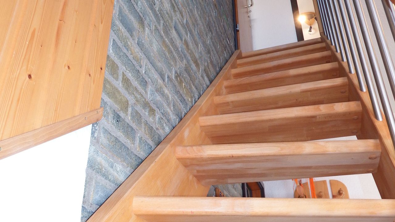 Über eine Holztreppe gelangen Sie in die obere Etage, wo sich 3 Schlafzimmer und ein Gäste-WC befinden. Alle Fenster sind mit Rollos versehen.
