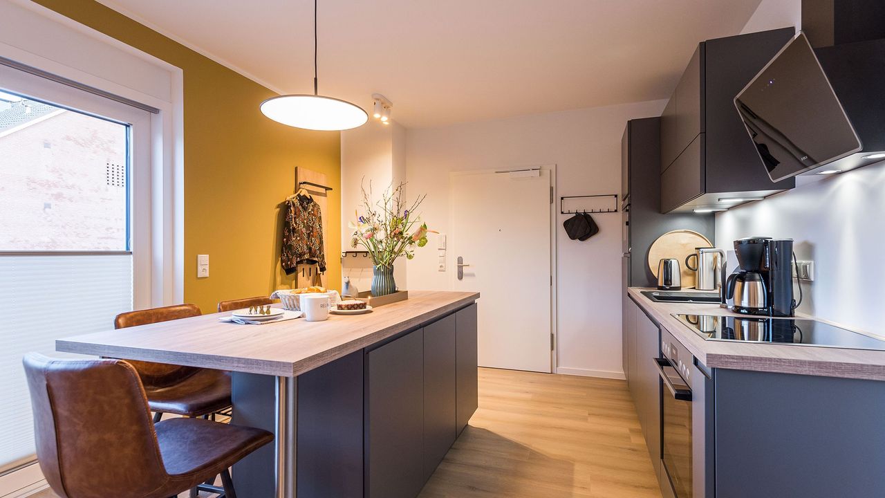 Sauna, 1 Whirlwanne sowie 1 Balkon (seitlicher Meerblick). Die Küche ist komplett ausgestattet und bietet zudem einen Esstisch. Zudem gibt es einen Geschirrspüler, einen Kühlschrank inkl. Gefrierfach, eine Mikrowelle sowie einen Waschtrockner. Im Wohnbereich erwartet Sie ein 55-Zoll-Smart-TV sowie