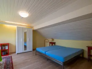 Die Ferienwohnung bietet ein Schlafzimmer mit großem Doppelbett im 1. OG, 2 weitere Schlafzimmer (ein Zimmer mit großem Doppelbett (1,80 x 2,00 m) sowie ein kleines Zimmer mit einem Bett (1,40 x 2,00 m) befinden sich im Dachgeschoss. Der großzügige Wohn- und Essbereich hat einen Südbalkon und eine große nach Westen ausgerichtete Loggia.Im Winter bietet ein Kachelofen Gemütlichkeit.
