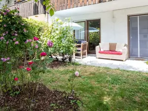 Ideal für Familien, gern auch mit Hund, ist die 58 qm große Wohnung, da kleiner eigener Garten und Terrasse in einer ruhigen Schotterstraße gelegen.Es gibt ein Schlafzimmer mit einem Doppelbett, einen Wohn-Essraum mit Gartenzugang und zwei Schlafsofas ,bis zu sechs Gästen.