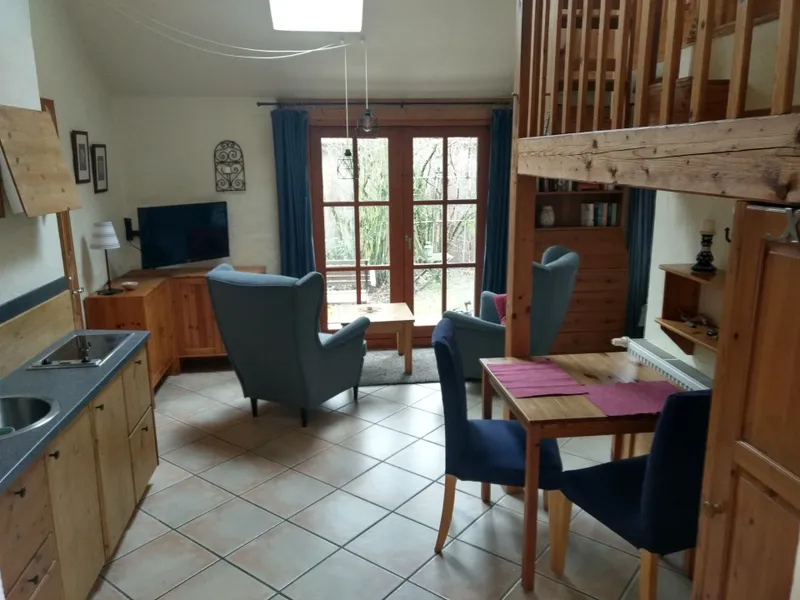 Außer Natur nix, aber davon reichlich! Ferienwohnung im Grünen vor den Toren Celles - perfekt zum Auspannen und Seele baumeln lassenDas Studio ist ca. 30 qm groß und ist für Familien mit 2 Kindern gut geeignet. Es ist hell und freundlich eingerichtet und hat zwei Ebenen. Im Küchen- und Wohnbereich ist die Decke entfernt, daher ist der Raum hoch und luftig. Die Möbel sind aus Kiefer, die Farbe blau dominiert. Ein Kaminofen sorgt bei kühler Witterung für behagliche Wärme. Große französische Doppel- fenster und Veluxfenster im Dach lassen viel Licht herein. Eine kleine Einbauküche, ebenfalls mit echter Kiefernfront, bietet neben einem Zwei-Platten Ceranfeld und geräumigem Kühlschrank mit Gefrierfach einen Backofen; Toaster und Kaffeemaschine sind selbst- verständlich und natürlich ist die Küche vollständig eingerichtet. Das Bad bietet eine geräumige, barrierefreie Dusche, viel Ablageplatz und fröhliche Farben. Im Wohnbereich gibt es gemütliche Sessel mit Blick in den Garten - eine große verglaste Doppeltür läßt viel Licht herein - und schöne Vollholzmöbel, die ein warmes Ambiente schaffen. Vom französischen Bett aus haben Sie ebenfalls Sicht in den Garten und es gibt im offenen Giebel zwei weitere Schlafmöglichkeiten, die über eine Treppenleiter zu erreichen sind - bei Kindern sehr beliebt!