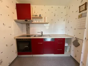 In der vollausgestatteten Küche befinden sich Kühlschrank, Spülmaschine, Mikrowelle sowie ein E-Herd mit Cerankochfeld und Dunstabzugshaube.