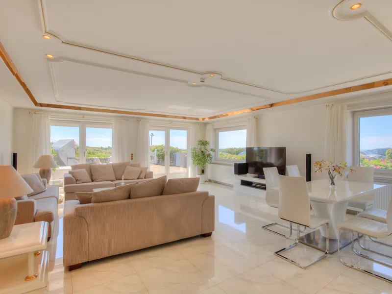 140 m² große 4 Zimmer-Ferienwohnung mit exklusiver Ausstattung, Meerblick und Südterrasse, 3 Schlafzimmern und 2 Duschbädern in Wenningstedt.Entdecken Sie diese komfortabel eingerichtete Ferienwohnung auf zwei Ebenen, idyllisch gelegen am Rande einer naturgeschützten Heidefläche mit traumhaftem Meeresblick.