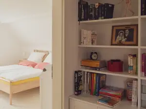 Die Ferienwohnung Liese bietet Platz für bis zu 6 Personen und liegt im oberen Teil des Hauses. Sie verfügt über eine modern eingerichtete Wohnküche mit großem Esstisch, eine gemütliche Leseecke, einem Bad mit Dusche und zwei Schlafzimmern auf insgesamt 63qm.Wenn die Ferienwohnungen getrennt vermietet sind, wird die Schiebetür zwischen Anne und Liese verschlossen. Der Eingangsbereich ist für eine gemeinsame Nutzung vorgesehen.