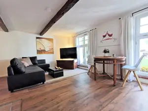 Im Erdgeschoss der Wohnung befindet sich der Wohnbereich, der mit einer bequemen Schlafcouch ausgestattet ist. Von dem Sofa haben sie einen schönen Blick in den kleinen Garten. Die Küchenzeile und der Essbereich sowie das Bad befindet sich ebenfalls im Erdgeschoss.