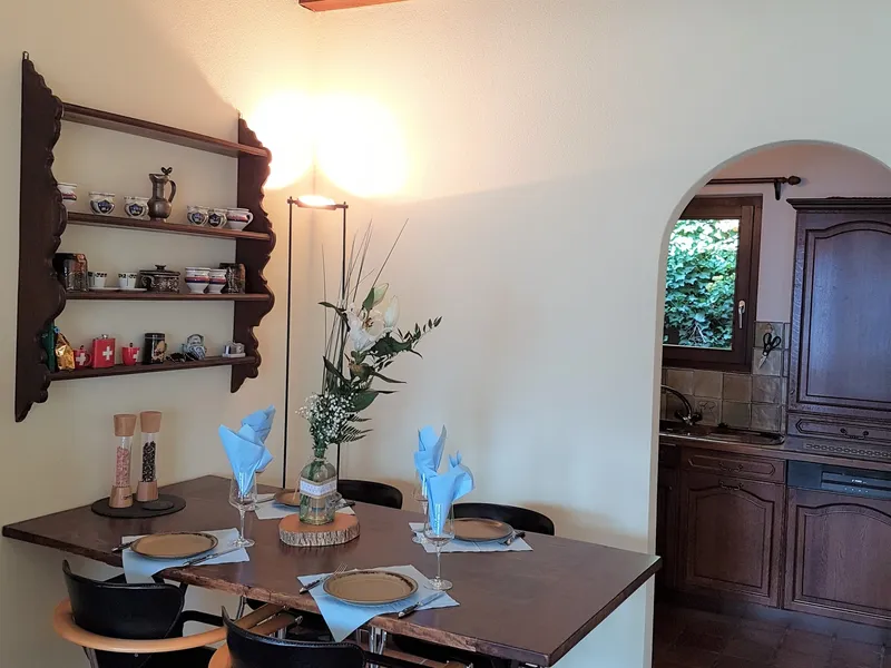 Über ein paar Stufen erreichen Sie die obere Ebene, wo Sie ein schön geschnittenes Wohnzimmer mit Essbereich sowie eine gut ausgestattete Küchenzeile sowie ein modernes Gäste-WC erwarten. Der großzügige Wohnraum überzeugt mit Tessiner Charme aufgrund der hohen Decke mit Holzbalken sowie einem offenen Kamin.