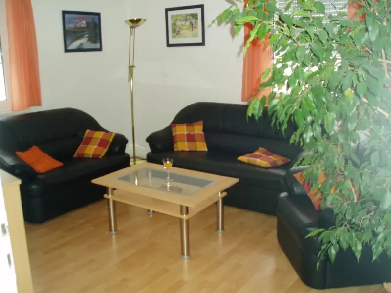 Im Wohnzimmer finden Sie einen Fernseher, Blurayplayer, DVD, Radio Und CD Minianlage, ein 2 Sitz und ein 3 Sitz Sofa und einen Sessel, Telefon und WLAN