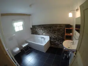 Auch das Bad im Erdgeschoss hat eine Bruchsteinwand. Hier kann man in der Badewanne entspannen.