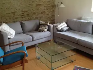 Dem Wohnzimmer verleiht eine Bruchsteinwand ganz besondere Atmosphäre. Ein großer LED-Fernseher, ein DVD-Player und eine Musikanlage sorgen für Unterhaltung.