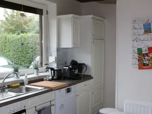 Im Erdgeschoss befindet sich ein helles, geräumiges Wohnzimmer mit einem Esstisch für bis zu 8 Personen und einer gemütlichen Sofaecke – ideal für gemeinsame Abende. Zwei Hochstühle sind ebenfalls vorhanden. Die voll ausgestattete Küche verfügt über einen Ceranfeldherd, Geschirrspüler, großen Kühlschrank mit Tiefkühlfächern, Mikrowelle, Kaffeemaschine, Senseo- und Tassimo-Maschinen, Wasserkocher und Toaster. Für die Kleinsten gibt es einen Flaschensterilisator und einen Fläschchenwärmer, die nach Bedarf genutzt werden können.