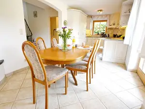 Ankommen und wohlfühlen: Die Doppelhaushälfte „Haus Nini“ lädt zum erholsamen Urlaub mit der ganzen Familie ein.Ein Kachelofen (dieser kann nicht genutzt werden) trennt den Wohnbereich harmonisch von dem Esszimmer und der angrenzenden offenen Küche. Dieser Ort wird bestimmt der Treffpunkt für gemütliche Stunden werden. Über den Essbereich gelangen Sie auf die großzügige Terrasse (ostseitig) und in den schönen, eingewachsenen Garten, welcher Ihnen zur alleinigen Nutzung zur Verfügung steht. Sicherlich ein Ort zum Verweilen und es heißt „abschalten und entspannen“. Ein Flur mit Garderobe sowie ein separates Gäste-WC vervollständigen das Erdgeschoss. Das Obergeschoss beherbergt zwei Schlafzimmer mit Doppelbetten und schönen Blick in die Natur. Über beide Schlafzimmer kann der Balkon betreten werden. Ein weiteres Schlafzimmer mit Einzelbett ergänzt den Schlafbereich. Das Badezimmer auf dieser Ebene ist mit Dusche und WC ausgestattet. Die Böden sind mit Fliesen oder Parkett versehen und mit Fußbodenheizung ausgestattet.