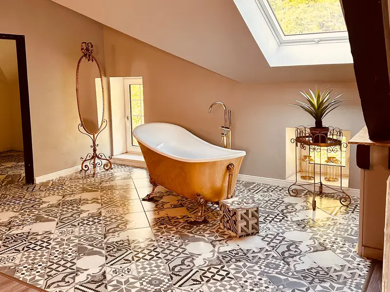 Machen Sie Ihren Romantikurlaub zu einer ganz persönlichen Erinnerung voller Ruhe und Zweisamkeit. Lassen Sie sich von unserem besonderen Ambiente verzaubern. Perfekte Location für einen wundervollen Heiratsantrag oder Ihren persönlichen Romantikurlaub in einer luxoriösen Suite. Hier erwartet Sie eine Studiosuite, frisch renoviert, kombiniert mit besonderen Details: goldenes Doppelbett, Badewanne im Raum, offene Küche, Saunabereich....Verfügbare Zusatzleistungen