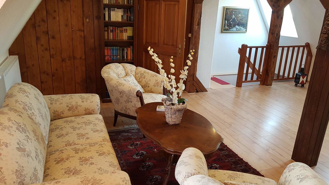 Im DG finden Sie neben den drei Schlafräumen mit je einem Doppelbett, ein Bad mit Wanne und Sitzdusche, einen großen Aufenthaltsraum mit gemütlichem Sofa und weichen Sesseln. Der Raum ist ausgestattet mit einem grossen Flachbildschirm TV, DAB-Radio mit USB-Anschluss, CD und Bluetooth- Lautsprechern, Spielen und einer Bibliothek.